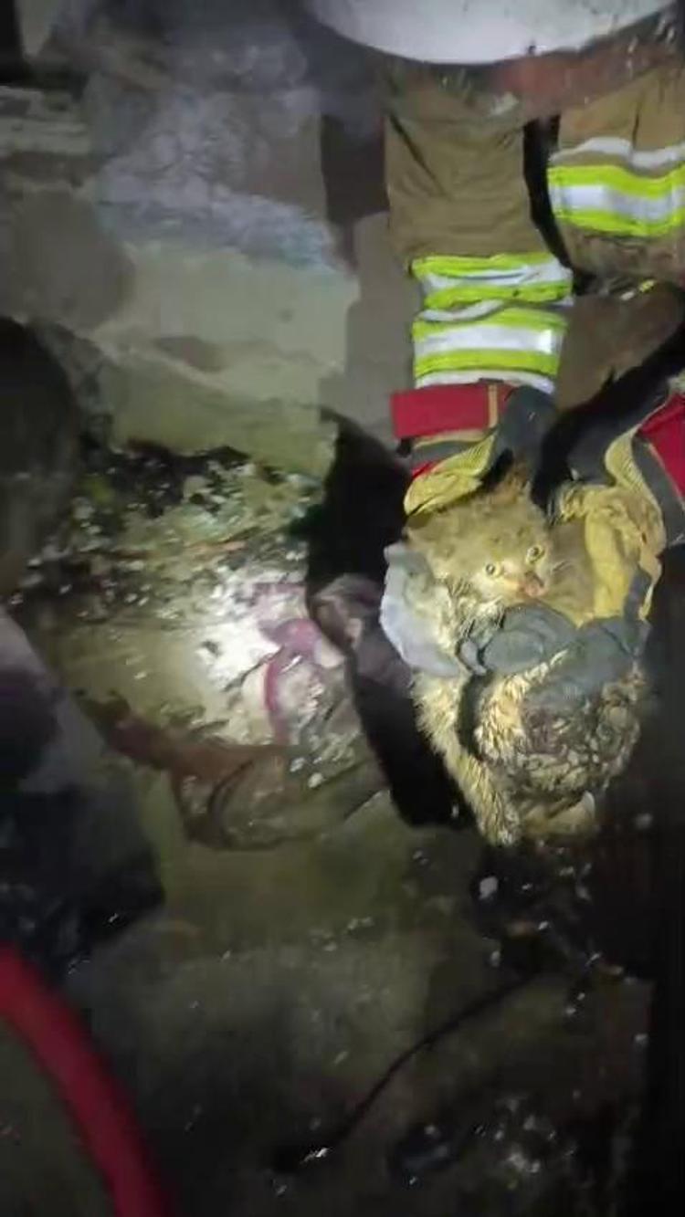 Hatay’da ev yanında mahsur kalan kediyi itfaiye kurtardı
