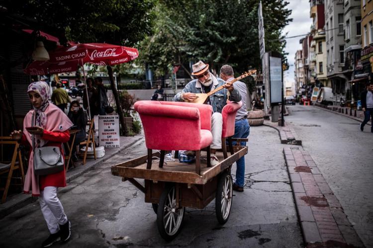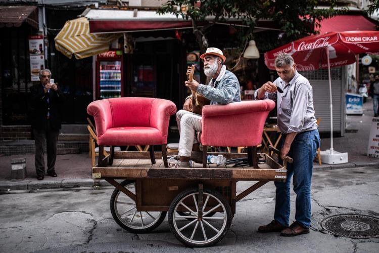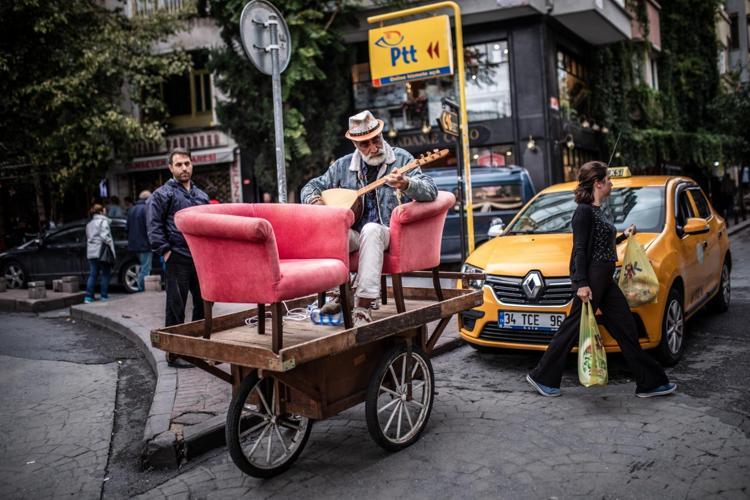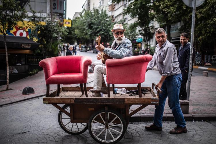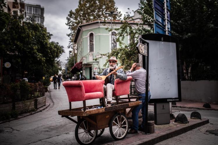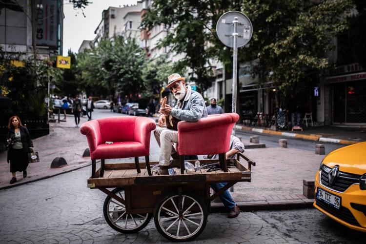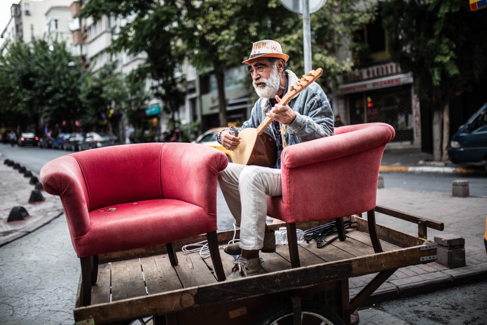 Bir hurdacının el arabası üzerindeki koltuklara oturan sokak müzisyenine ilgi büyüktü.