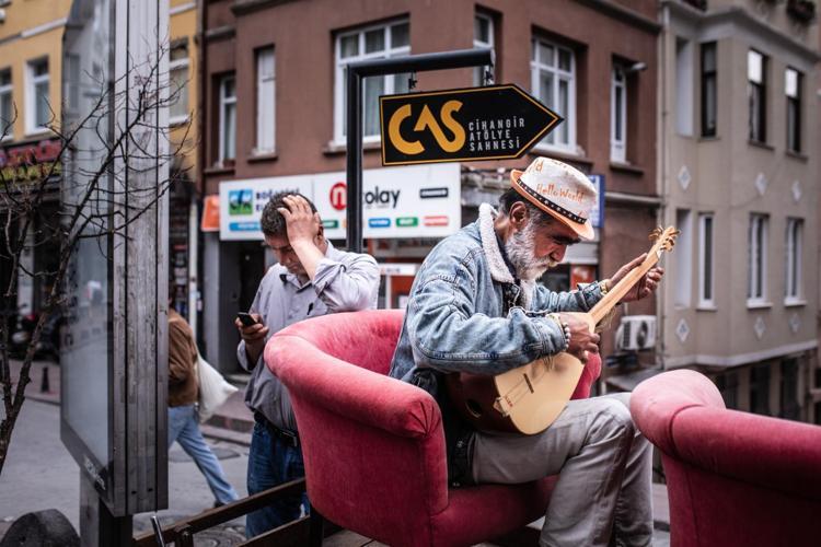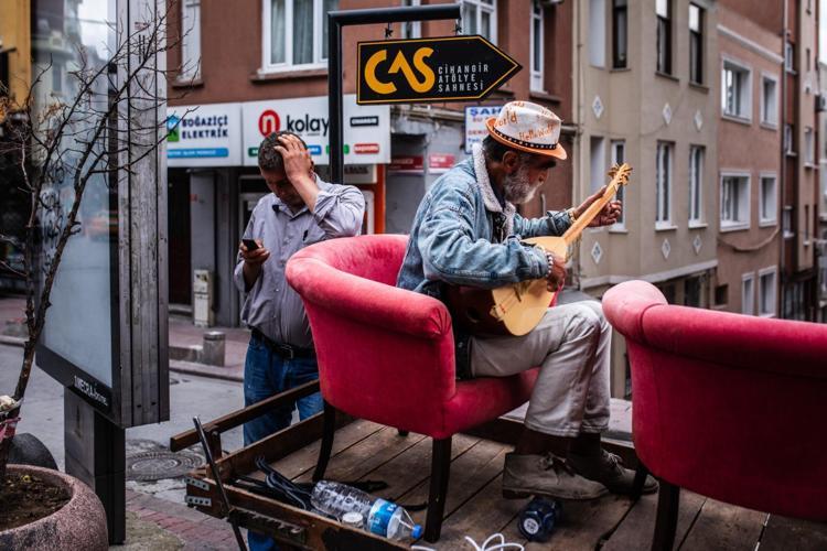 Beyoğlu Cihangir’de bir sokak müzisyeni, pazar kahvaltısı için gelen Cihangirlilere bağlama eşliğinde verdiği konser ile ilgi odağı oldu.