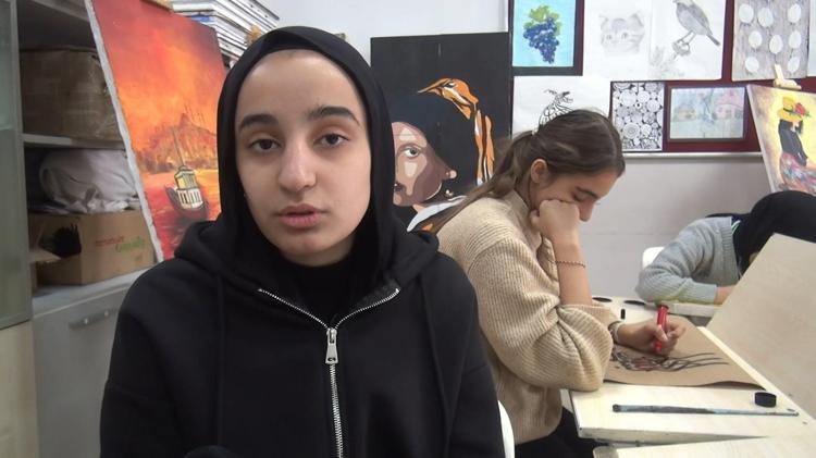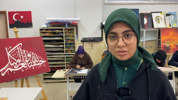 Öğrenci Nazelin Ay, “Burada hat sanatını öğreniyoruz arkadaşlarla beraber. Gerekli olan malzemelerin hepsini elde ettik. TÜBİTAK projesinde umarım birinci olarak çıkaracağız. Hat sanatı, kültürümüzde önemli bir yere sahipti aslında yavaş yavaş da önemini geri kazanıyor. Bunu yapmamızın sebebi hem Osmanlı kültürünü yaşatabilmek hem de eski Türkçeyi, eski dilleri insanlara daha iyi öğretebilmek. Bu kapsamda çalışıyoruz. Başta zorlanmamızın sebebi de aslında kolay bir sanat olmaması, biraz zorlayan bir sanat. Adım adım çalıştık, yavaş yavaş ilerledik. Önce kağıtla başladık sonra tuvale geçiş yaptık. Öyle ilerlemeye devam ediyoruz şu an. Öğrencilerin boş zaman aktivitesi olarak değerlendirebilecekleri mantıklı bir seçim hat sanatı. Çünkü hem insanın sabrını test edebiliyor hem de resim yeteneğini geliştirebiliyor” ifadelerini kullandı.
