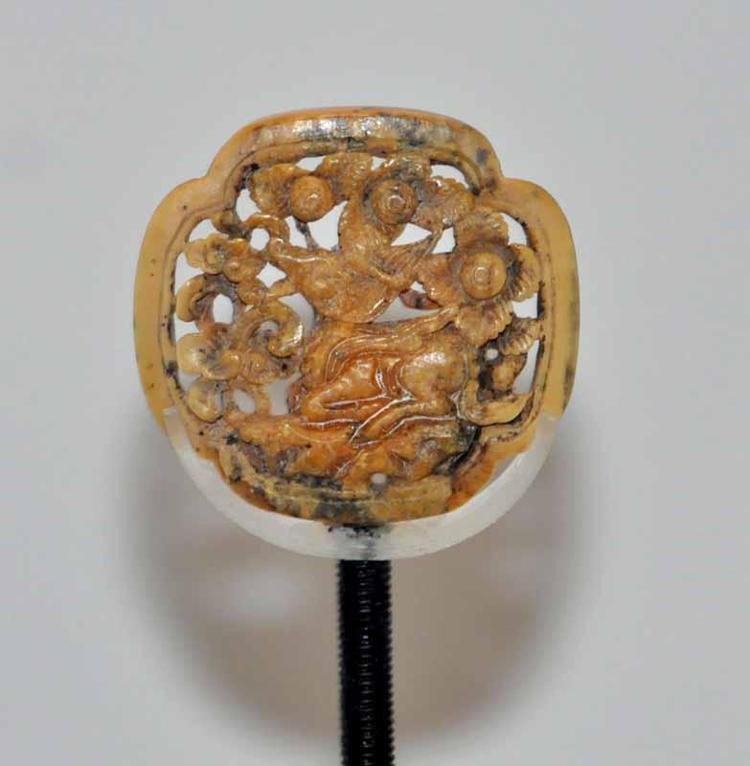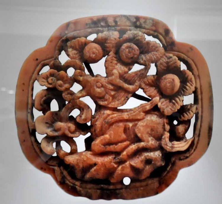 "Figüratif ve bitkisel bezemelerin hakim olduğu eserde; merkezde ejder, kuş ve farklı toynaklı hayvanların bileşiminden oluşan gerçeküstü bir figür yer alıyor. Ağzı açık şekilde betimlenen bu figürün üst çenesi, yukarı doğru çift dönüşlü bir volüte sahip. Ejder betimlemelerinde ise karakteristik özellik olarak sivri kulak, badem göz, çenenin altından yukarıya doğru uzanan volütlü kıvrılma, çene altından başlayıp boynun belirli bir kısmını çevreleyen ve yukarı doğru yönelen kanat biçimli sakal görülüyor. Eserdeki diğer figür olan balık, yer ejderi figürünün toynakları altında bedeni basınçla kıvrılmış, yüzgeçleri derin çentikler ile vurgulanmış, iri bir göz ve açık bir ağızla tasvir edilmiş. Balık figürünün hemen altında bir adet askı yuvası bulunuyor."