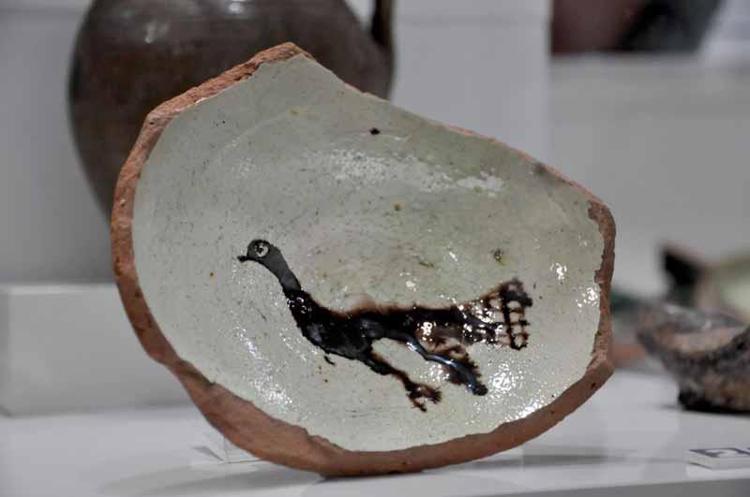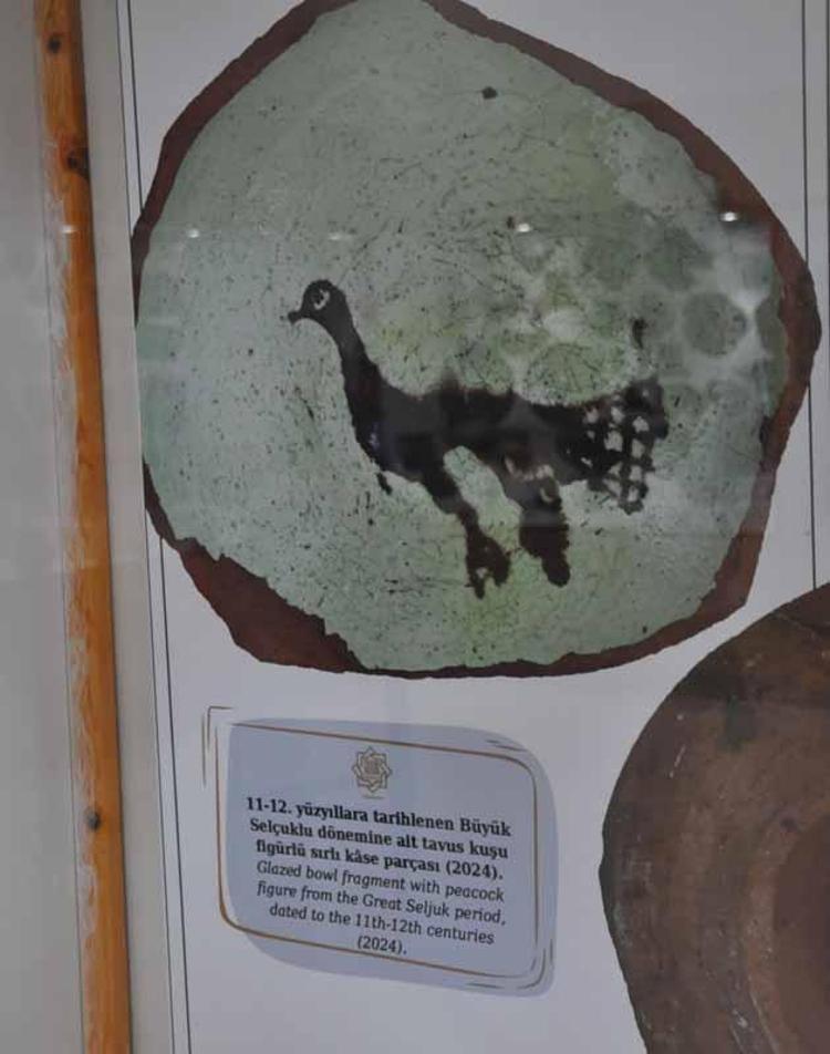 Hakim Aslan, 11-12'nci yüzyıllara tarihlenen ve Orta Çağ döneminde 'cenneti' simgeleyen tavus kuşu figürlü sırlı kase parçasının 2024 yılında yapılan kazı çalışmalarında gün yüzüne çıkarıldığını ve bu kasenin de sergide ilk kez sanatseverlerle buluştuğunu sözlerine ekledi.