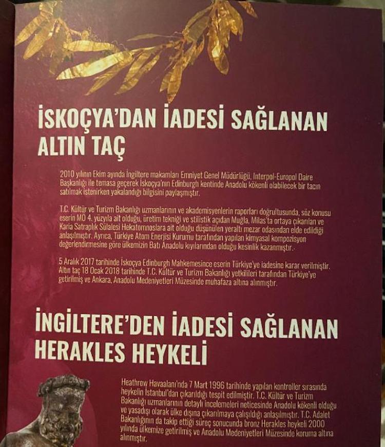 Londra'dan iadesi sağlanan 'Herakles' heykeli ile İskoçya'da getirilen M.Ö. 4’üncü yüzyıla ait Batı Anadolu Medeniyetleri kökenli 'altın taç', Hırvatistan ve Macaristan’dan iadesi sağlanan çeşitli altın tabak, altın kaşık, sikke, süs eşyaları ve bronz aynanın arasında olduğu 897 eser, 'Kaçış Yok' sergisinde ziyaretçilerin ilgisine sunuldu.
