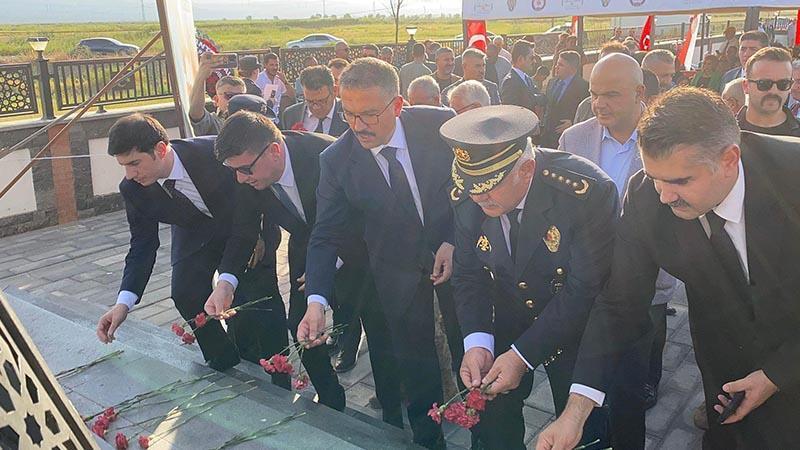 Törende konuşan Iğdır Valisi Ercan Turan, "Biz içimizde bizim gibi görünen bizim gibi olmayanların darbesini yedik. Hala bizim gibi görünen bizim gibi olmayan insanların farkındayız. Uyanığız, zindeyiz. Sayın Cumhurbaşkanımız, büyük bir misyon yükledi bu aziz millete. Mazlum milletlere umut olmaya devam ediyoruz. Önümüzdeki yüzyılı bizim yüzyılımız olarak ilan etti. Bu yüzyıla ‘İnşallah terörsüz Türkiye hedefiyle girelim. Barışla girelim, güzellikle girelim, güçle girelim, kardeşlikle girelim’ dedi. Ahlat'ta çok güzel bir mesaj verdi; 'Kılıç kından çıkarsa ne kelam ne kalem fayda eder' dedi. Herkesin aklını başına devşirmesi gereken bir dönemdeyiz. Bizim milletimiz ferasatli, basiretlidir. Kalp gözü açıktır bu milletin. Dünyada atalarımızın çekildiği yerde Filistin'de, Kafkaslar'da, Balkanlar'da, Orta Doğu'da huzur olmuyor. Niye? Çünkü benim atalarımın ferasetinden yoksun bir dünya düzeni var. Bu dünya düzenine adalet lazım. Hala giden şanlı akıncıyı bekliyorlar mazlum milletler. Rabbim burada andığımız 13 şehidimize karşı bizleri mahcup etmesin. Bedir şehitleri inanılmaz kutsaldır bizim için. Kerbela bizim için kutsaldır. Nice gazalar yapmışız. Kurtuluş Savaşımız. Kazım Karabekir mübarek insan. Gazi Mustafa Kemal Atatürk mekanları ali olsun. İşte bizim 15 Temmuz şehitlerimiz de böyledir. Buradaki 13 şehidimiz de böyledir. Hepsine borçluyuz. Şu an huzurluysak, güven içerisinde durabiliyorsak hepsine borçluyuz. Hakları bize geçti. Onları minnetle şükranla anıyoruz" diye konuştu.