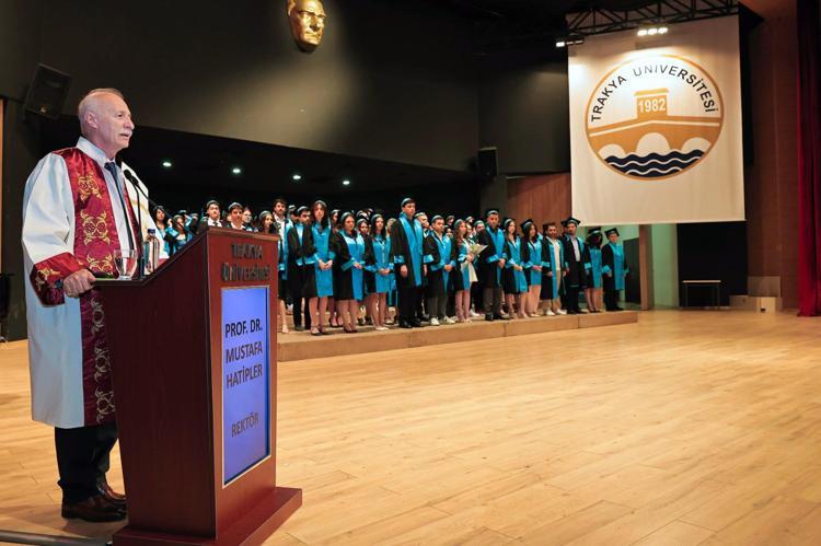Rektör Prof. Dr. Mustafa Hatipler de Edebiyat Fakültesi'nin Trakya Üniversitesi'nin entelektüel birikimi açısından son derece önemli bir eğitim birimi olduğunu ifade etti. Öğrencilerin yetişmesinde emeği geçen akademik ve idari personele teşekkür eden Prof. Dr. Hatipler, "Bundan sonraki hayatınızda geceye yenilmeyin. Geceye yenilmeyen her kişiye mükafat olarak bir şafak, bir sabah ve bir güneş verilir" dedi.