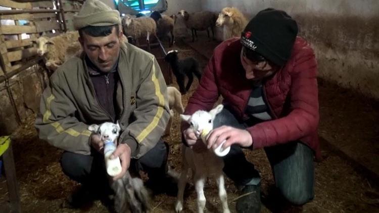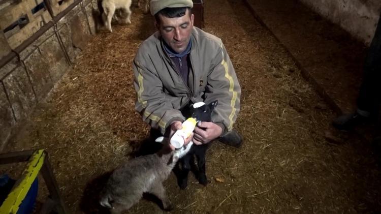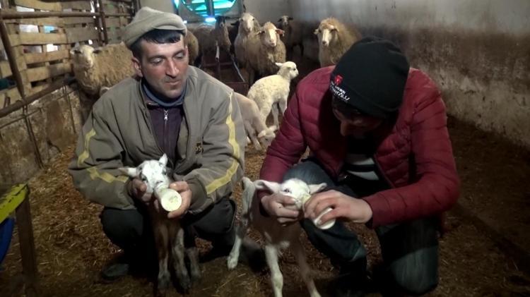 Muş'ta bir çiftlikte çobanlık yapan Barış Özcan, yeni doğan ikiz kuzuları biberonla besliyor. Özcan, "Şimdiye kadar doğan 80 kuzunun 40'ı ikiz. Anne sütü yetersiz kalınca çiftliklerdeki inekleri sağarak sütü biberonla kuzulara veriyoruz" dedi.