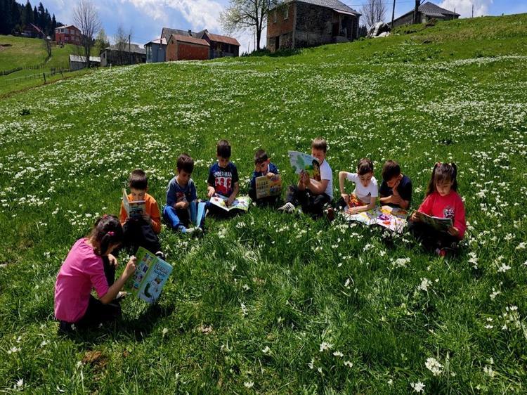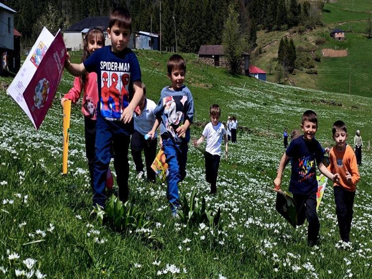 İlkokul öğrencileri yaylada rengarenk çiçekler arasında kitap okudu