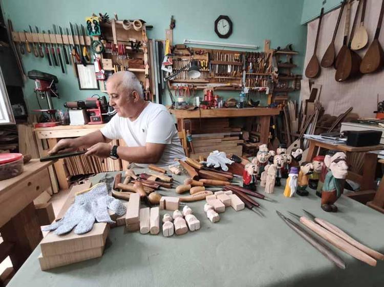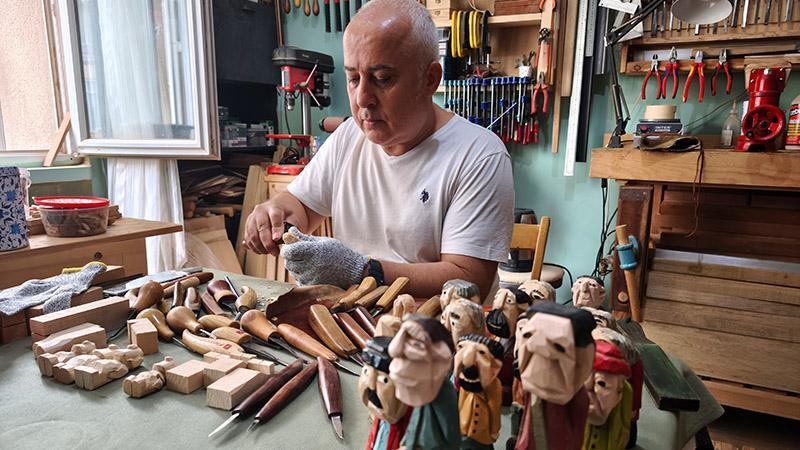 Edirne’nin Keşan ilçesinde Kültür ve Turizm Bakanlığı Somut Olmayan Kültür Mirası Taşıyıcısı Ahmet Uğur Parmaksız (55), internetten videolarını izleyerek yapmayı öğrendiği ahşap el yontması figürleri, katıldığı festivallerde sergiliyor.