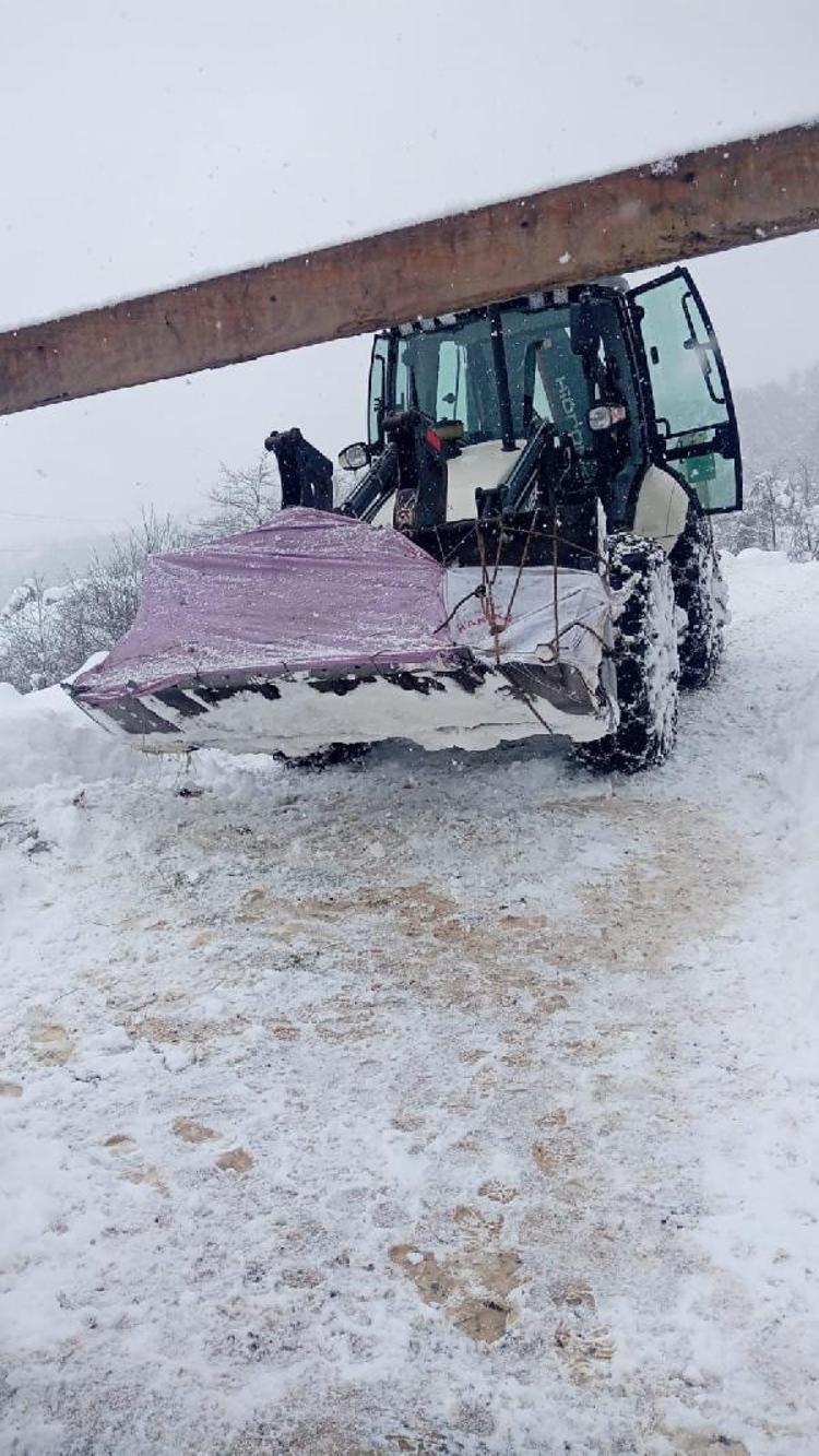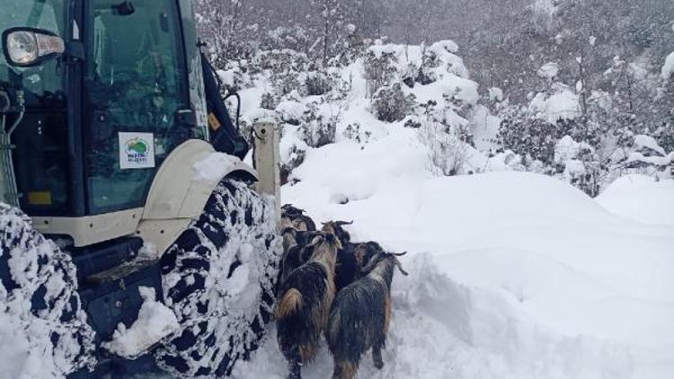 İhbar üzerine bölgeye gelen belediye ekipleri, iş makinası ile karla kaplı yolu açarak hayvanlara ulaştı.