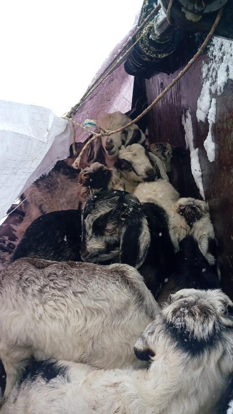 İş makinesi operatörü Sinan Şişman, kepçeye koyduğu 30 yavru keçi ile 2 yavru köpeği, soğuktan korumak için üstlerini de örtüyle kapattı.