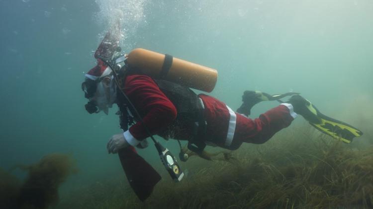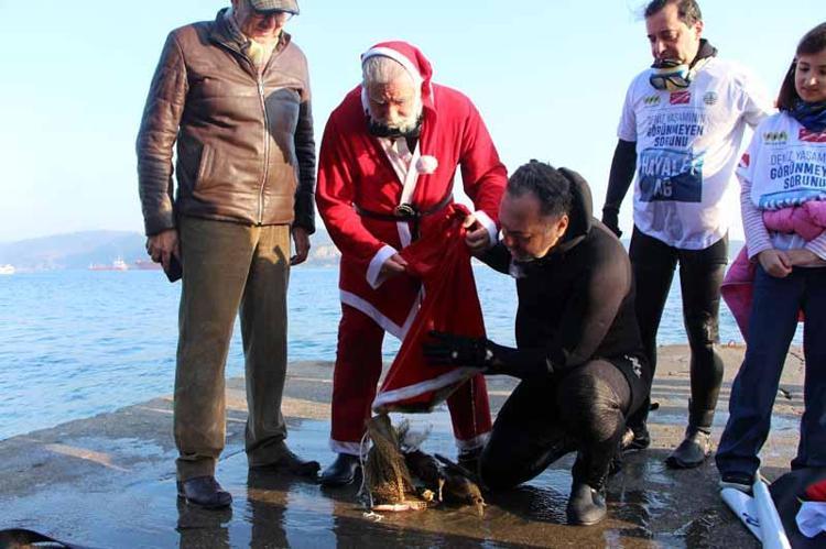 Noel Baba kılığındaki dalgıç Saruhan Singen gelecek kuşakların istavrit ve hamsi yemesi için denizlerimizi korumanın önemine dikkat çekerek "Görüyorsunuz plastik balıklar.