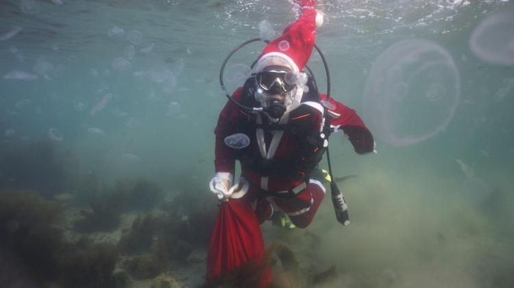 Yaklaşık yarım saatlik dalış ile Noel Baba bu sefer denizden plastik balık ve şişeler çıkardı.