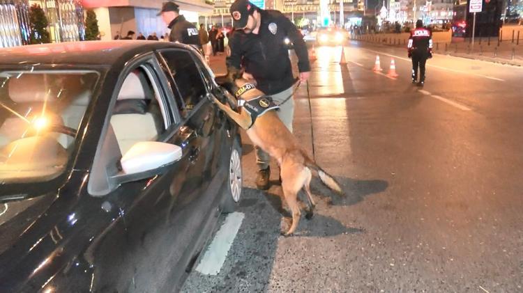 Taksim Meydanı'nda Saat 20.00'de başlayan denetime polis helikopteri ve narkotik köpeği Komançi de destek verdi.