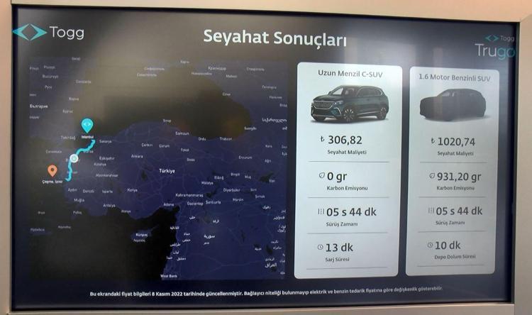 Merkezdeki bilgilendirmeye göre TOGG marka C-SUV, 306 lira 82 kuruÅŸ maliyet ile İzmir'e giderken, 1.6 motorlu bir C-SUV'la ise 1020 lira 74 kuruÅŸa İzmir'e seyahat edilebileceÄŸi hesaplandı. İlk ÅŸubesi İstanbul'da açılan TOGG Deneyim Merkezi'nin Türkiye genelinde 20'ye çıkarılması bekleniyor.Â