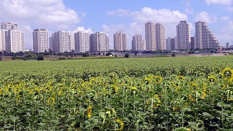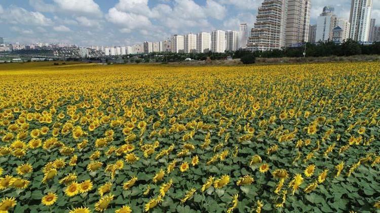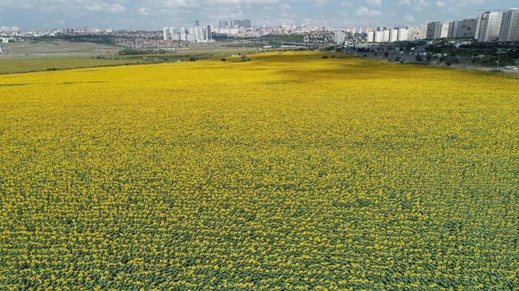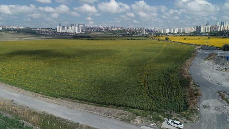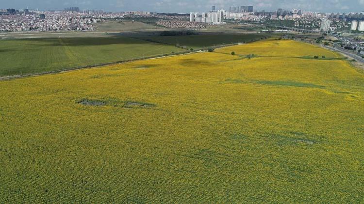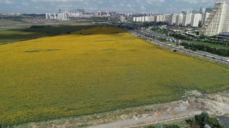 Avcılar'daki bir tarafta geniş tarım arazisinde ekilen ayçiçekleri yükselirken diğer tarafta ise yüksek katlı binalar ilginç görüntüler oluşturdu. Yükselen binaların yanındaki ayçiçek tarlaları havadan görüntülendi.