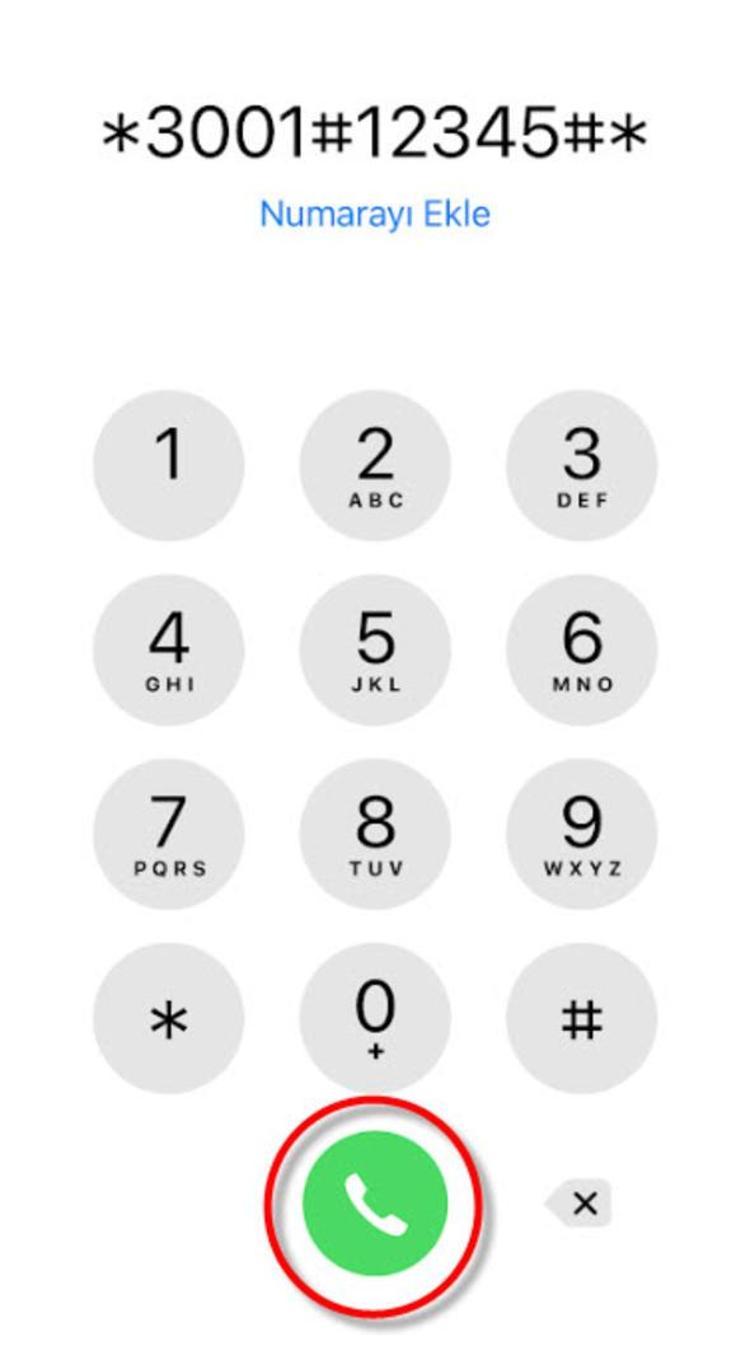 Daha sonra tuş takımına *3001#12345#* yazıyoruz.