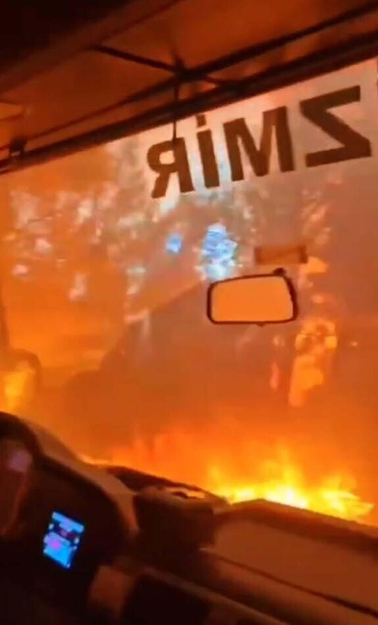 İzmir'in Buca ilçesindeki ormanda çıkan yangına müdahale, 2'nci gününde de sürüyor. Bu arada yangına müdahale eden ekiplerin alevler içinde kaldığı anlar cep telefonuyla görüntülendi.