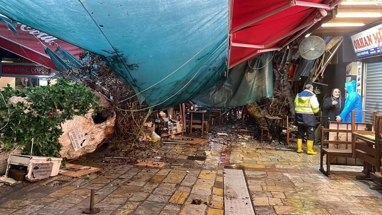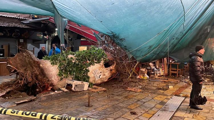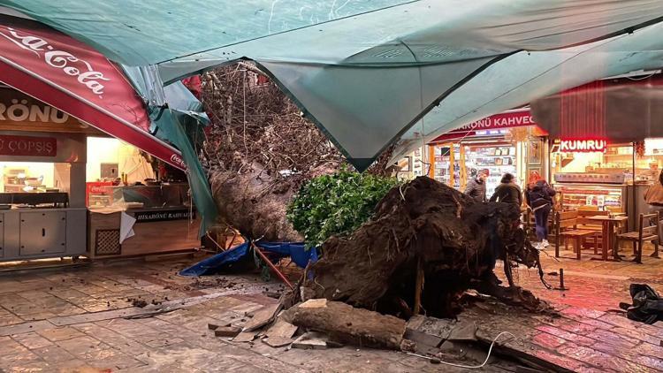 İzmir'de sağanak yağmur ve rüzgar olumsuzluk yaratıyor. Tarihi Kemeraltı Çarşısı'nda bulunan Hisarönü caminin önünde yer alan meydandaki asırlık çınar ağacı kökünden devrildi. Yüzlerce insanın uğrak yerlerinden birinde gerçekleşen olayda yaralanan olmadı.