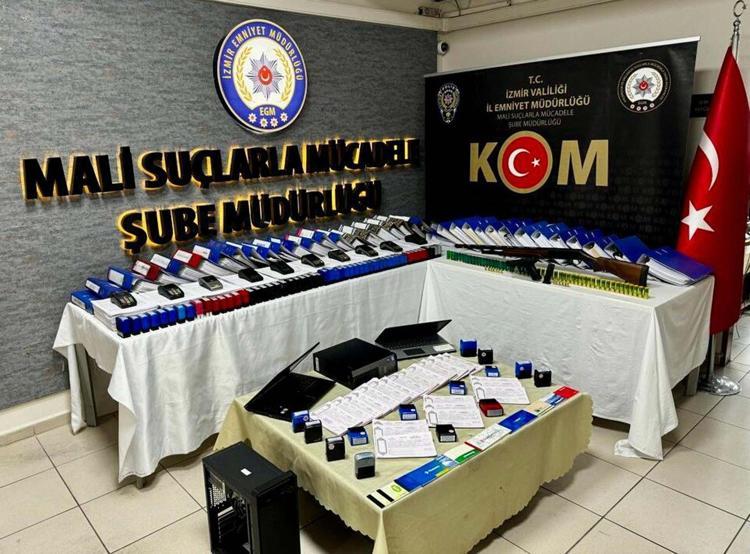 Şüphelilere ait ev ve işyerlerinde yapılan aramalarda ise 59 adet klasör içerisinde çeşitli firmalar adına kesilmiş 10 milyar 978 milyon 367 bin 665 TL e-fatura, bedeli 2 milyar 500 milyon 987 bin 566 TL olan 5 bin 745 adet dolu senet, bedeli 1 milyar 725 milyon 355 bin olan 987 adet tahsilat makbuzu, 40 adet çek, farklı firmalarca düzenlenmiş 500 dekont, 166 boş senet, 94 adet kaşe, 71 sayfa boş çek koçanı, 20 pos cihazı, 6 boş fatura koçanı, çeşitli firmalara ait içerisinde muhtelif sayıda çeşitli dekontlar ve çek nüshaları bulunan 12 adet klasör, 1 tabanca, 14 mermi, 1 av tüfeği, 54 kartuş, çok sayıda suç unsuru olan muhtelif evrak, belge ve doküman ele geçirildi.