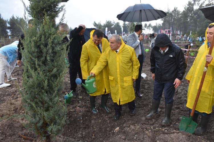 Tarım ve Orman Bakanlığı Orman Genel Müdürlüğü, her yıl 11 Kasım Milli Ağaçlandırma Günü’nde vatandaşlarla birlikte milyonlarca fidanı toprakla buluşturuyor. Bu yıl da 'Yeşil Vatan Seferberliği' temasıyla, Türkiye’de 81 ilde fidanları toprakla buluşturuldu. Yangınlarından en çok etkilenen illerden olan İzmir’de 2025 yılında çıkan 148 yangında 10 bin 639 hektar orman alanı etkilendi. İzmir'de ağaçlandırma gününde 21 farklı lokasyonda 770 dekar alanda, 115 bin fidan toprakla buluşturuldu. Menderes ilçesi Kısıkköy’de İzmir Orman Bölge Müdürü Mahmut Yılmaz, AK Parti İzmir milletvekilleri Ceyda Bölünmez Çankırı ve Mahmut Atilla Kaya, İzmir Vali Yardımcısı Nusret Şahin ve kent protokolünün katılımıyla fidan dikim töreni düzenlendi. Tören esnasında yağmaya başlayan sağanak, toprağa dikilen fidanlara can suyu oldu.