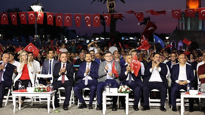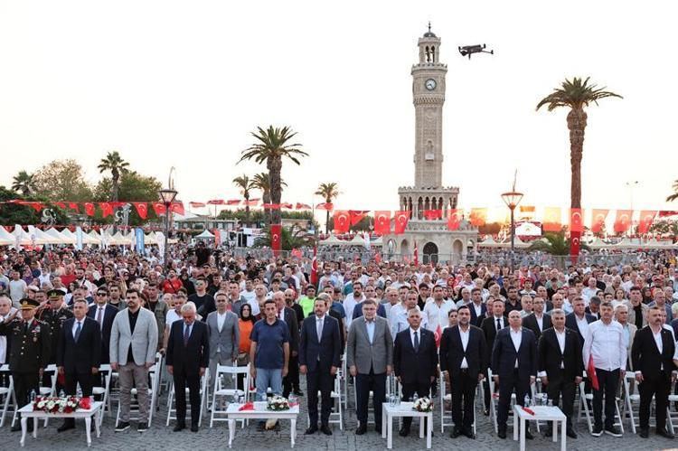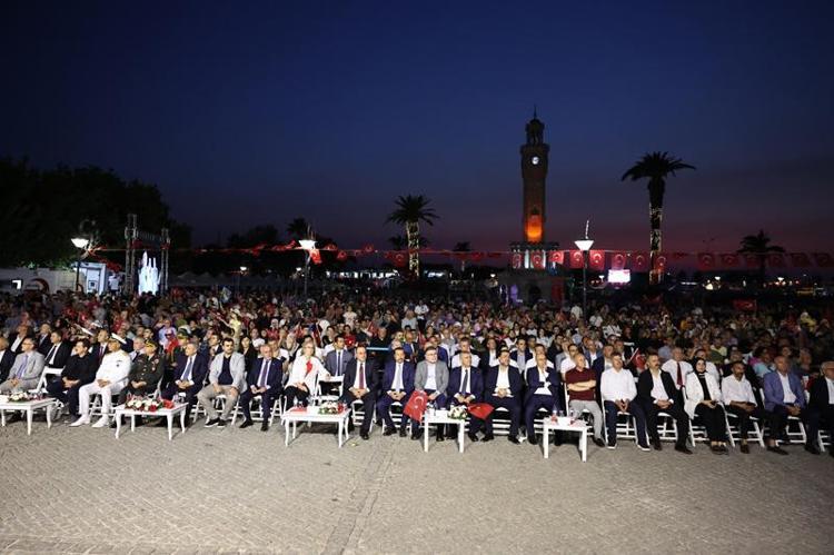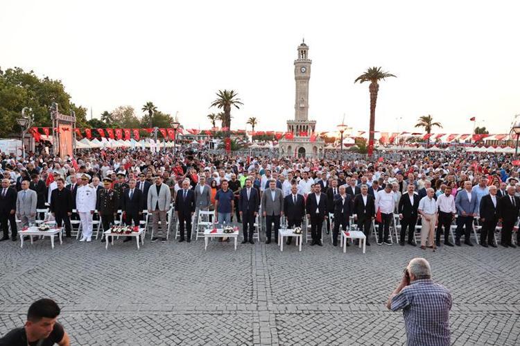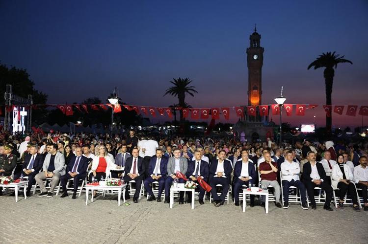 İzmir'de ‘15 Temmuz Demokrasi ve Milli Birlik Günü' dolayısıyla Atatürk Meydanı’nda tören düzenlendi. Törende; İzmir Valisi Süleyman Elban, Ege Ordusu Komutanı Orgeneral İrfan Özsert, İzmir Cumhuriyet Başsavcısı Ali Yeldan, Sahil Güvenlik Ege Deniz Bölge Komutanı Tuğamiral Tayfun Paşaoğlu, AK Parti Genel Sekreteri ve İzmir Milletvekili Eyyüp Kadir İnan, AK Parti İzmir İl Başkanı Bilal Saygılı, İzmir Büyükşehir Belediyesi CHP Grup Başkanvekili Altan İnanç, MHP İzmir İl Başkanı Veysel Şahin ile AK Parti ve MHP milletvekilleri katıldı. Saygı duruşu ve İstiklal Marşı'yla başlayan etkinlik, Kur’an-ı Kerim Tilaveti, ilahi ve kaside konseriyle devam etti. Program, Cumhurbaşkanı Recep Tayyip Erdoğan'ın Beştepe'den halka seslenişinin ekrana getirilmesi ile sürdü.