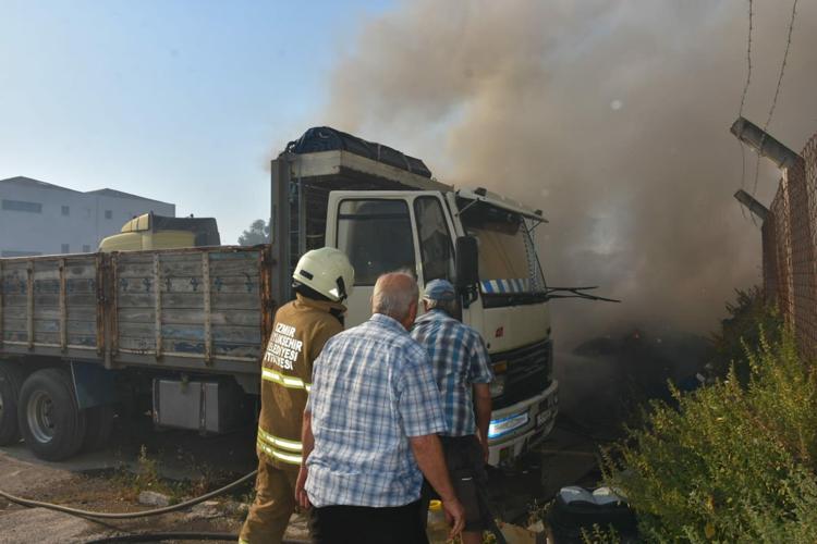 İzmir'de atıl haldeki fabrikanın bahçesi ile yakınındaki TIR garajında çıkan yangın kontrol altında