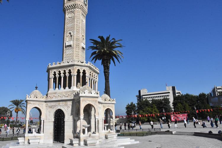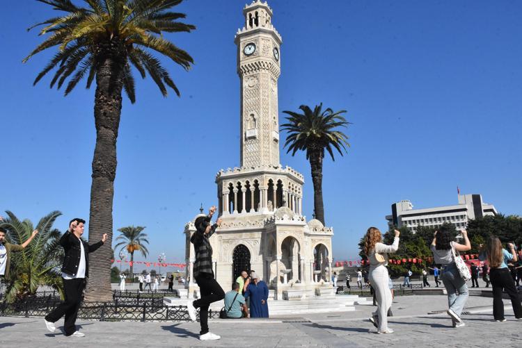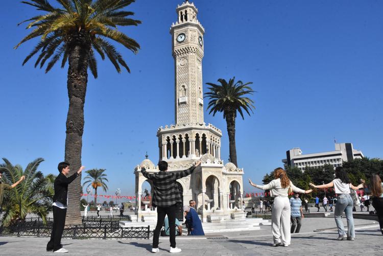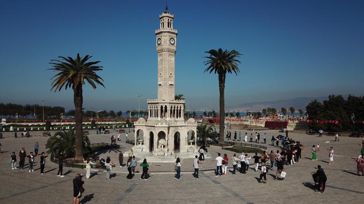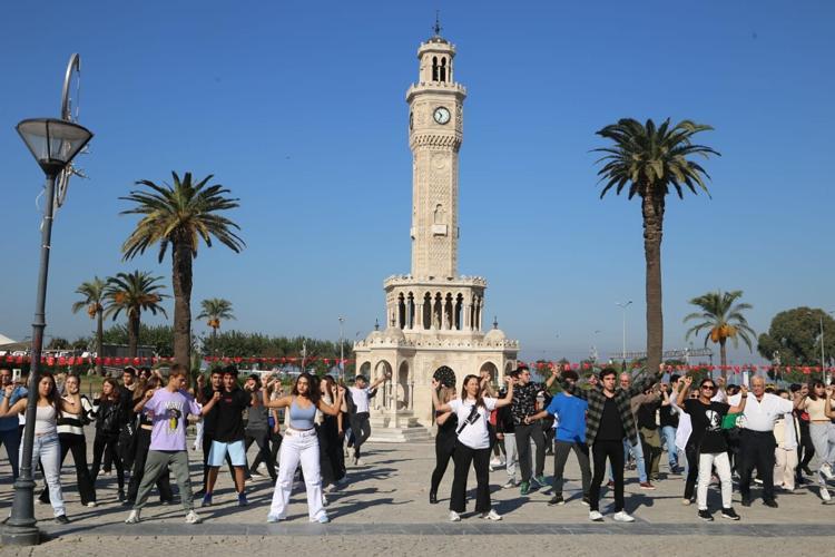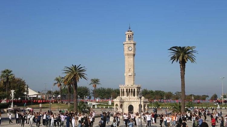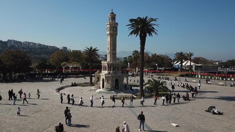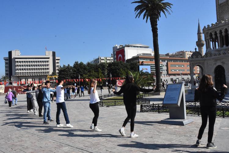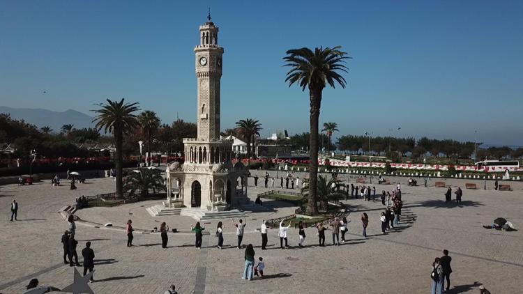 İzmir İl Milli Eğitim Müdürlüğü'nce cumhuriyetin 100'üncü yılı kutlamaları kapsamında zeybek gösterisi yapıldı. Tarihi saat kulesi etrafında oynayan zeybek, renkli görüntüler oluşturdu.