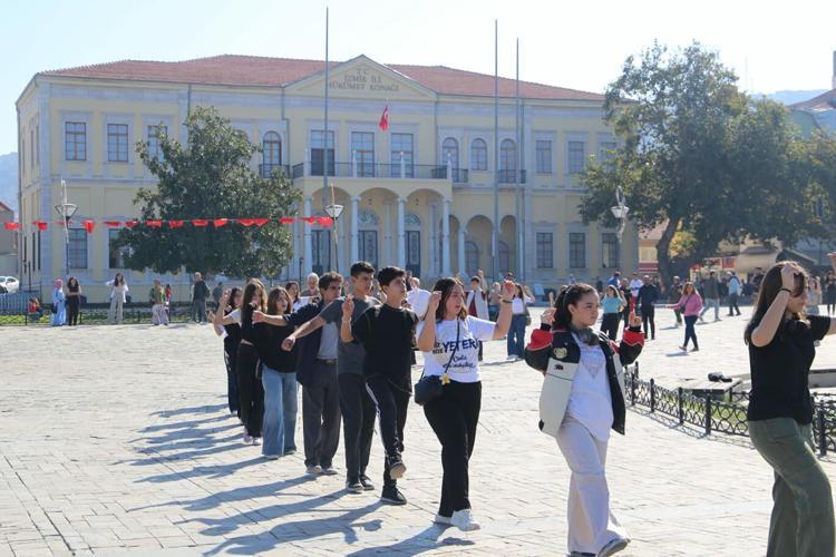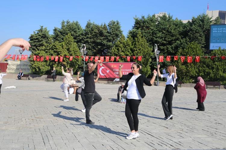 Bu kapsamda; İl Milli Eğitim Müdürlüğü bünyesindeki halk eğitimi merkezlerindeki eğitmenler ile kursiyerler, Konak Meydanı'ndaki tarihi saat kulesi etrafında 'Cumhuriyetimizin 100. Yılında 100 Zeybek' adı altında zeybek oynadı. Büyük ilgi gören oyun, cep telefonu kameraları ile de görüntülendi.