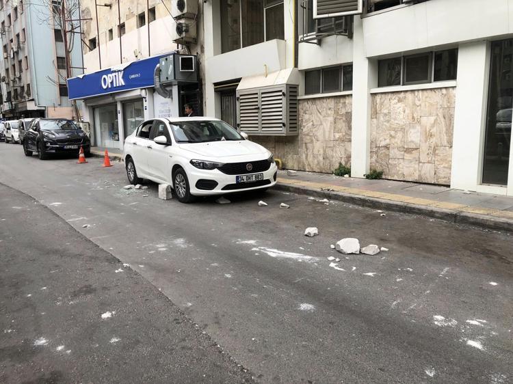 Konak ilçesi İsmet Kaptan Mahallesi 1375 Sokak’taki bir otelin çatısında bulunan gaz betonlar, park halindeki otomobilin üzerine düştü.