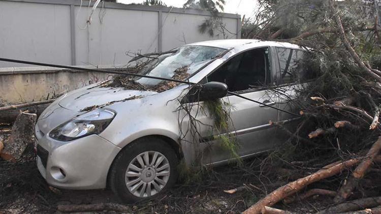 İzmir’de kuvvetli rüzgarda park halindeki otomobilin üzerine ağaç devirdi