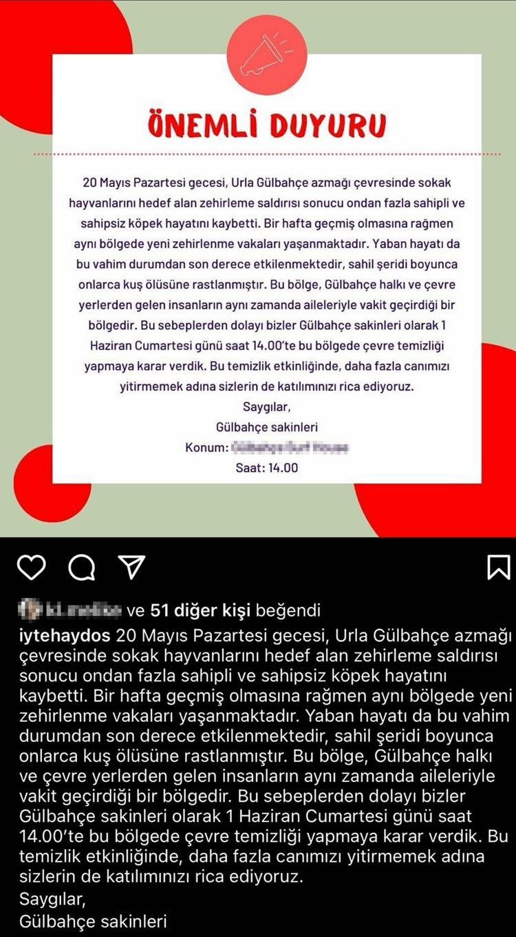 Urla ilçesi Gülbahçe Mahallesi'nde oturanlar, 20 Mayıs gecesi, sokakta besledikleri köpeğin ağzından köpükler geldiğini fark etti. Köpeğin zehirlendiğini gören mahalleli, durumu belediye ve polise bildirdi. Mahalle halkı bölgede başka hayvanların da zehirlenmiş olabileceği ihtimaliyle çevrede inceleme yaptı. Çok sayıda köpekte aynı semptomların yaşandığı belirlenirken, veterinerler ve mahalleli zehirlenen köpekleri kurtarmak için çalışma yaptı ancak hayvanlar kurtarılamadı. Köpekleri zehirleyenlerin bulunması için polise şikayette bulunuldu. Polis, olayla ilgili soruşturma ve Urla Tarım ve Orman Müdürlüğü ekipleri de inceleme başlattı. Urla Belediyesi, 6 köpeğin zehirlenip öldürüldüğünü tespit ettiklerini bildirdi. İlçe Tarım ve Orman Müdürlüğü tarafından alınan numunelerde köpeklerin yüksek düzeyde metomil (tarım ilaçlarının ana etken maddesi) verilip, zehirlendikleri belirlendi. Polisin, köpekleri zehirleyen kişi veya kişilerin belirlenip yakalanması için çalışması sürerken, mahalleli ise sosyal medya hesabından bu kişi ya da kişilerin bulunması için yardımcı olacak bilgileri verenlere 70 bin TL ödül vereceklerini duyurdu.