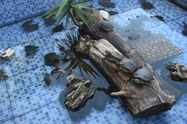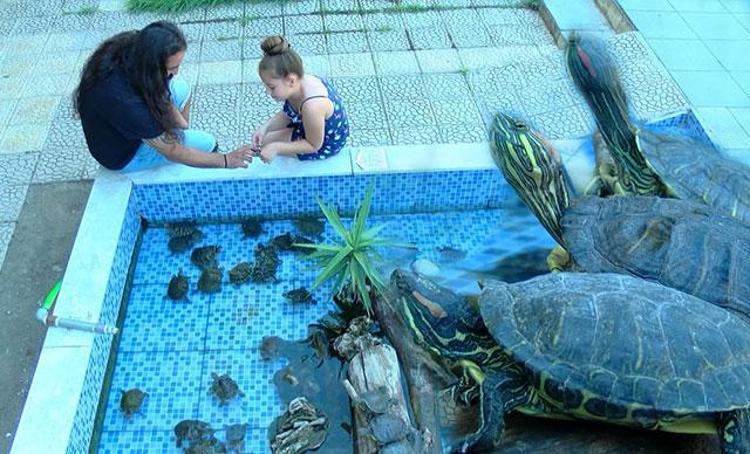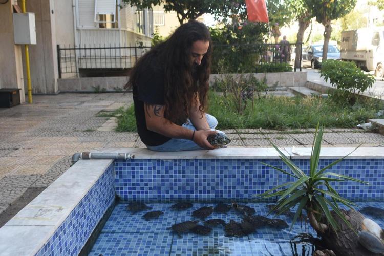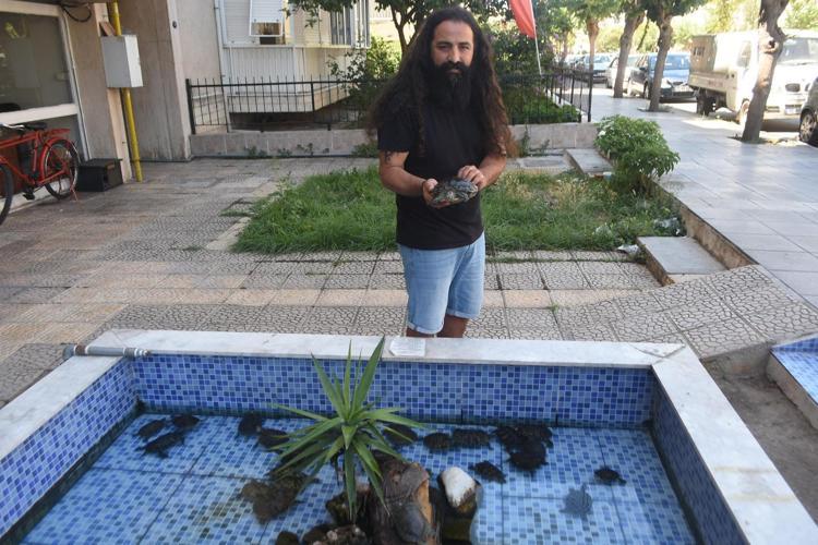 İzmir’de fotoğrafçılık yapan Volkan Çakır'ın (39) iş yerinin önünde bulunan süs havuzu, hayvanseverlerin bakamadığı su kaplumbağalarına ev sahipliği yapıyor. Vatandaşların zamanla büyüyen kaplumbağalarını, yaşam alanları dar geldiği için süs havuzuna bırakması üzerine, burada onlarcası bir arada yaşamaya başladı. Bugüne kadar yaklaşık 2 bin kaplumbağaya süs havuzunda baktığını söyleyen Çakır, zaman içinde onları doğaya bırakarak sirkülasyonu sağlıyor.