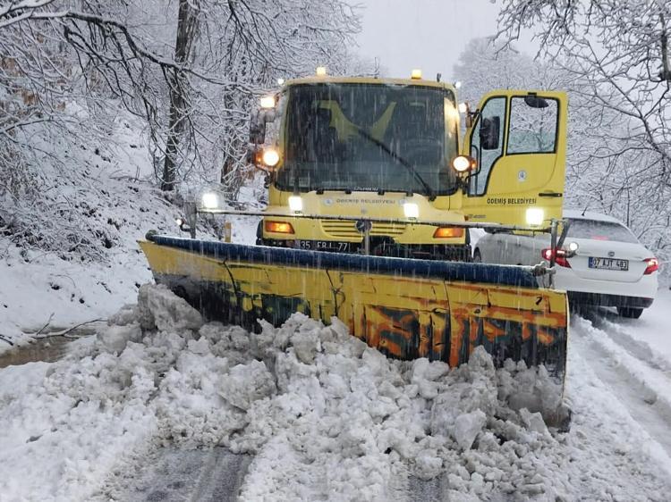 İzmir'in Ödemiş, Kemalpaşa ve Karabağlar ilçelerinde yüksek kesimlere kar yağdı. Büyükşehir Belediyesi ekipleri, yolların kapanmaması için kar küreme çalışması yaparken, yolda kalan araçlar da çekildi.