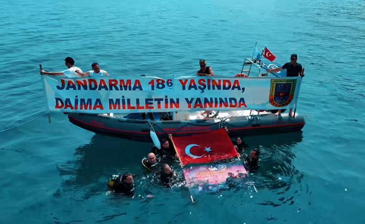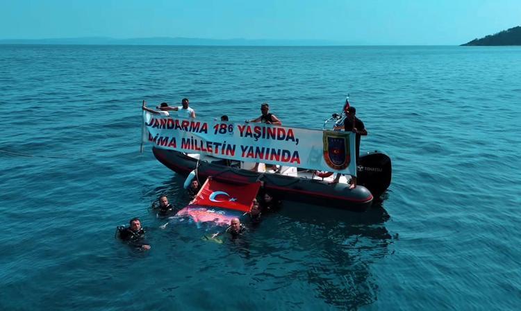 Tekirdağ İl Jandarma Komutanlığı personeli, Jandarma Teşkilatı'nın kuruluş yıl dönümü dolayısıyla Edirne'nin Saros Körfezi'ne kıyısı bulunan Keşan ilçesine bağlı Gökçetepe köyü sahiline batırılan tanka dalış yaparak, su altında Türk bayrağı açtı.