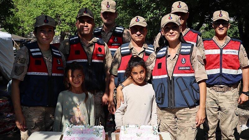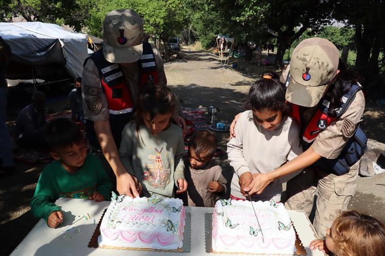 Erzincan’ın Üzümlü ilçesinde çalışan mevsimlik tarım işçisi ailelerin çocukları Fatma Yiğit (8) ve Feride Gözek’e (11), jandarma sürpriz doğum günü kutlaması yaptı.