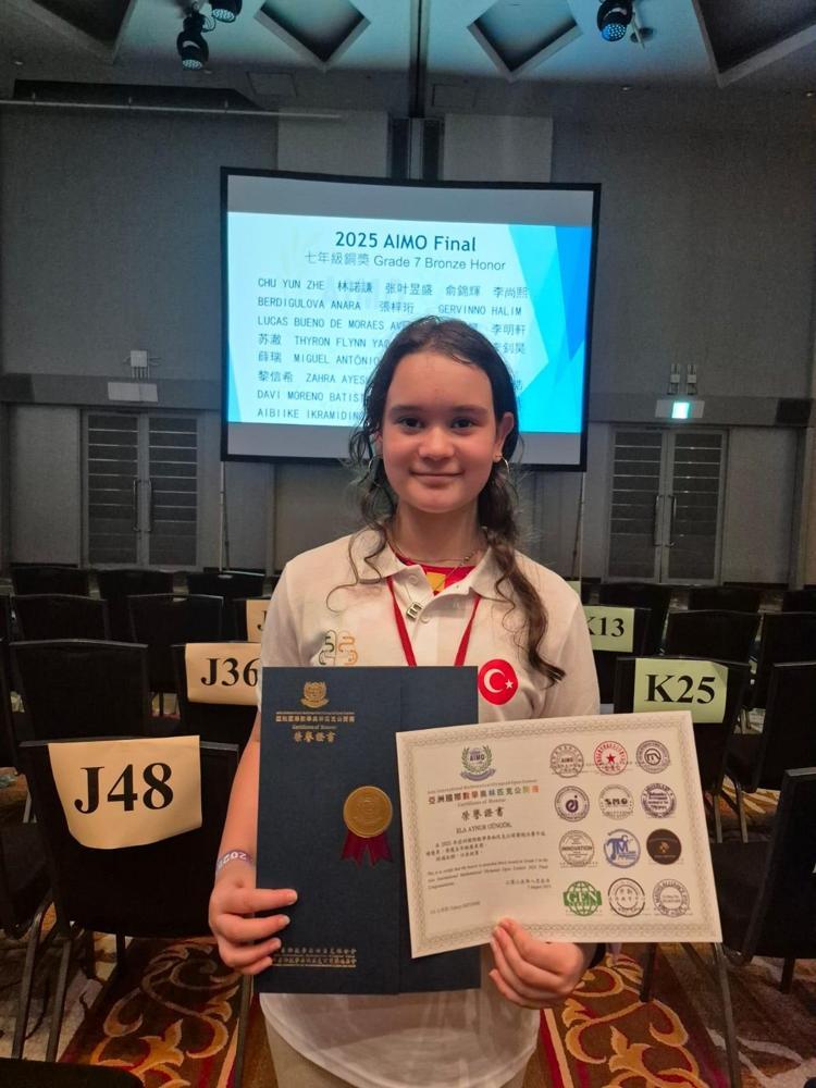 Japonya’da düzenlenen Asya Uluslararası Matematik Olimpiyatları’nda 4’üncü sınıf öğrencisi Kerem Tunçel ile 5’inci sınıf öğrencisi Eymen Üstün, kendi kategorilerinde bronz madalya kazanarak dünya üçüncüsü oldu. 5’inci sınıf öğrencisi Ela Aynur Güngör’e ise Liyakat Ödülü (Merit Award) verildi. Öğrencilerin başarısından dolayı gurur duyduklarını söyleyen danışman öğretmen Fatma Ağaçdiken, "Karşılaştıkları zorluklara rağmen hiçbir zaman pes etmediler, hedeflerine odaklanarak azimle çalışmaya devam ettiler. Elde edilen bu sonuç hem ülkemiz hem de ilimiz adına önemli bir gurur kaynağı olurken, gelecekteki başarılarının da habercisi oldu. Bu vesileyle öğrencilerimizi ve ailelerini tebrik ediyor, onlara destek olan tüm eğitim kadromuza teşekkür ediyorum” diye konuştu.