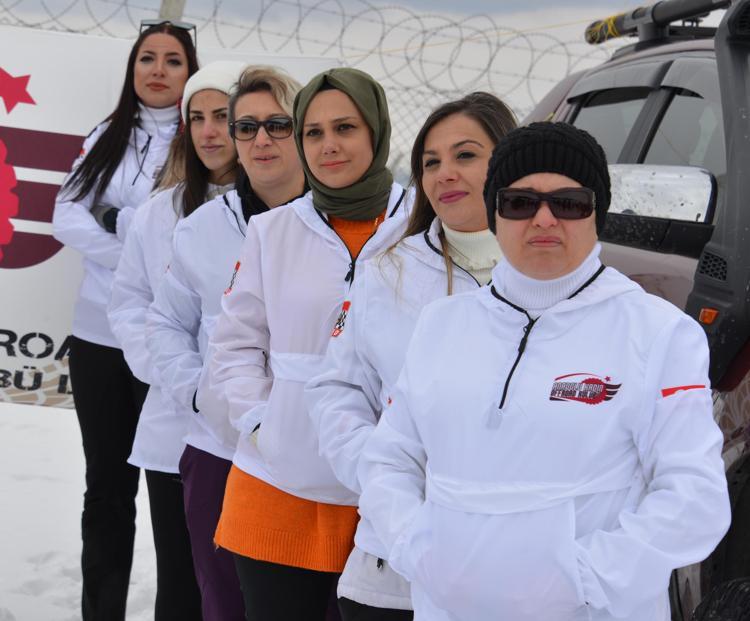 Direksiyon başında hünerlerini sergileyen kadınlar, karlı arazide derin çukurları geçerek gösterilerini tamamladı.