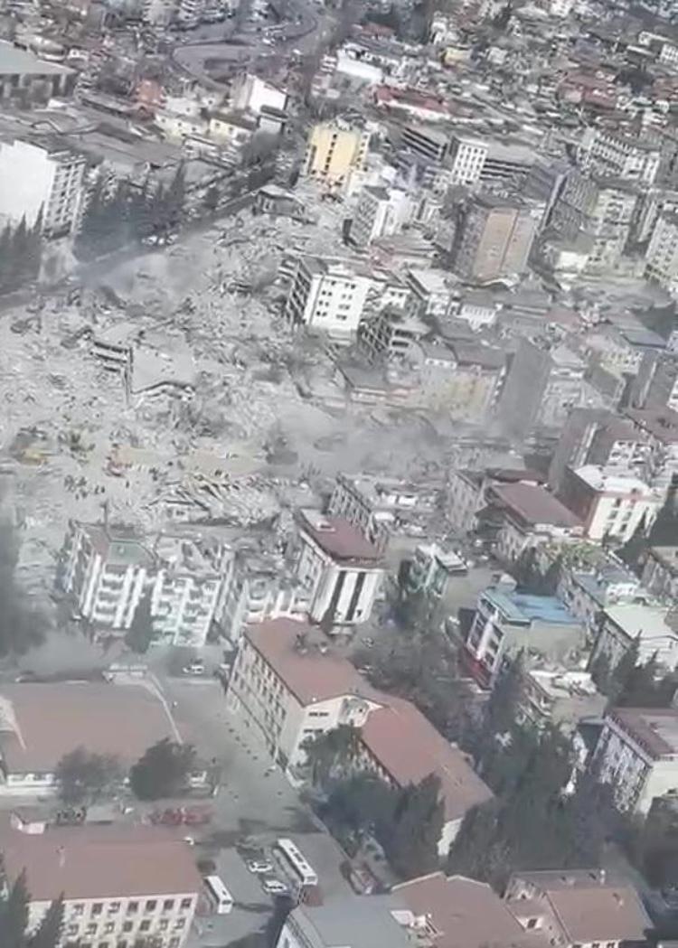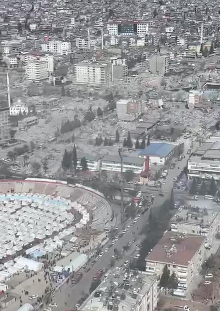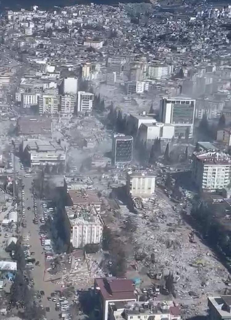 Türkiye'de 10 ilde yıkıma yol açan ve kapsadığı alan itibarıyla 'asrın felaketi' olarak tanımlanan depremlerin merkez üssü Kahramanmaraş'ta, helikopterle çekilen görüntü ile felaketin büyüklüğü bir kez daha gözler önüne serildi. 4 bin 497 yapının yıkıldığı kentte 10 binden fazla kişi yaşamını yitirirken, her geçen saat can kayıplarındaki artış, yürekleri dağlıyor.