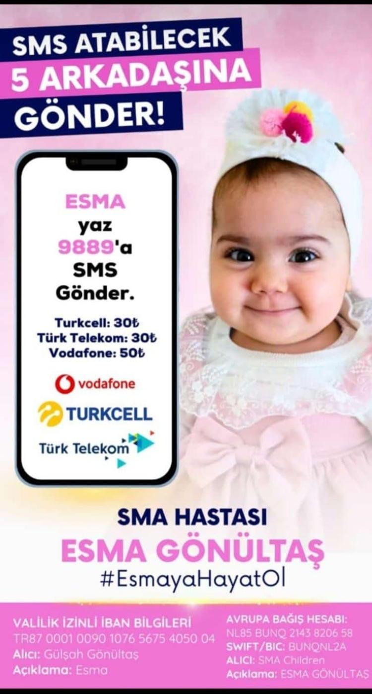 Bornova ilçesinde oturan Halil Gönültaş-Gülşah Gönültaş çiftinin üç sağlıklı çocuğunun ardından 17 Temmuz 2024'te dünyaya gelen kızları Esma Gönültaş'a, 7 günlükken topuğundan alınan kanla SMA Tip 1 teşhisi konuldu. Haftanın 3 günü fizik tedavi desteği alan Esma'nın gen tedavisinden faydalanabilmesi için açılan bağış kampanyası yüzde 90 seviyesine ulaştı. Gülşah Gönültaş "Doğduktan 7 gün sonra topuk kanından SMA Tip 1 olduğunu öğrendik.