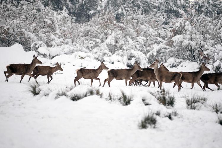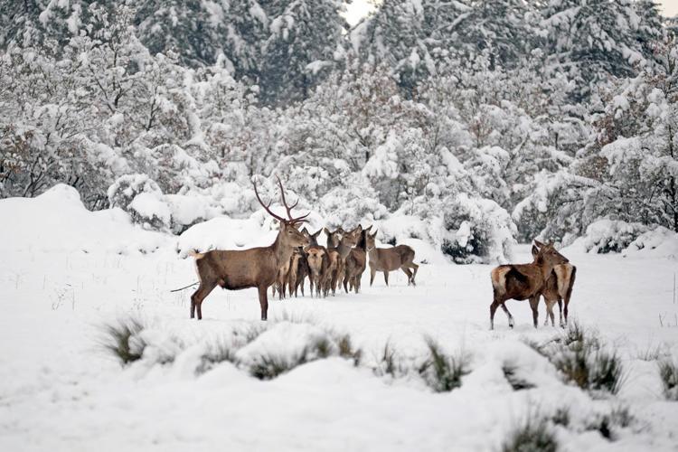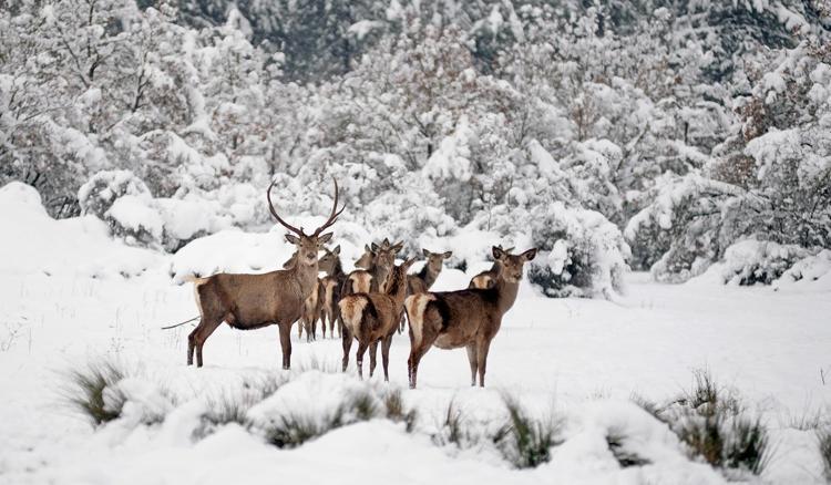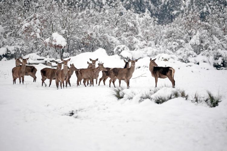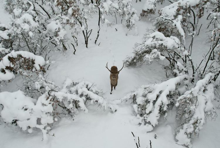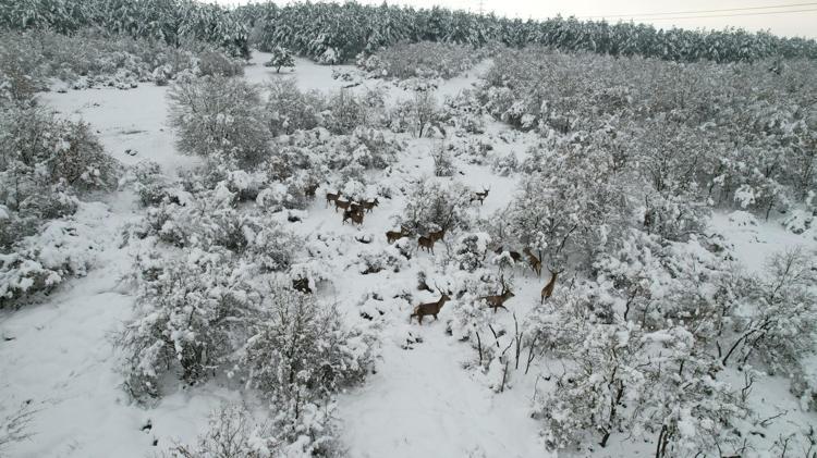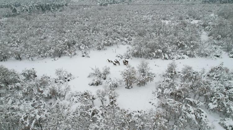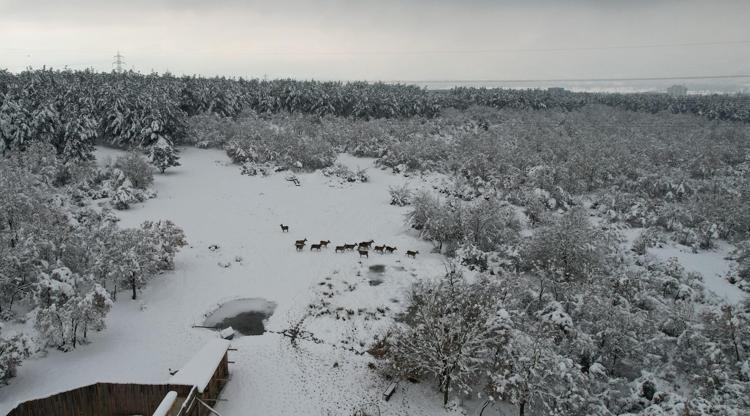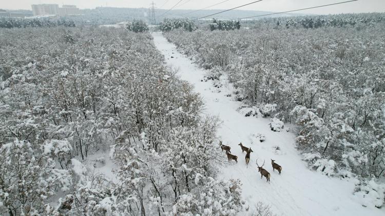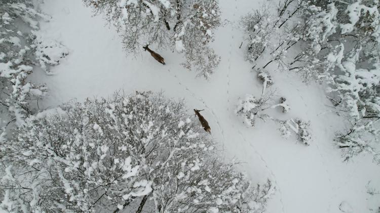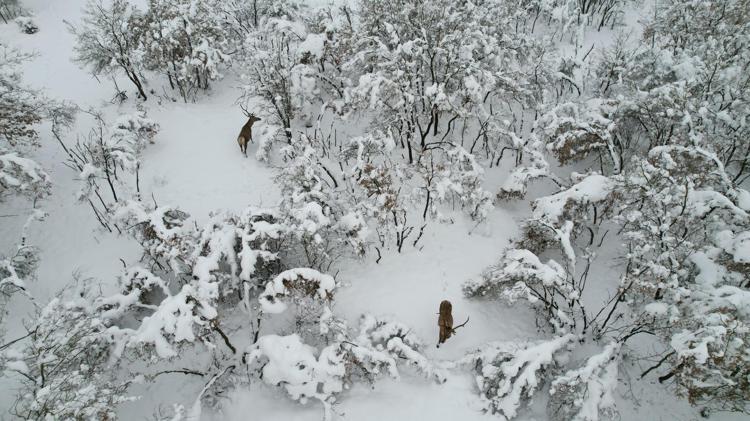 Kampüsteki kızıl geyikler beyaz örtüde; o anlar dronla görüntülendi