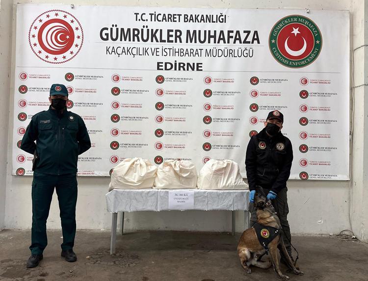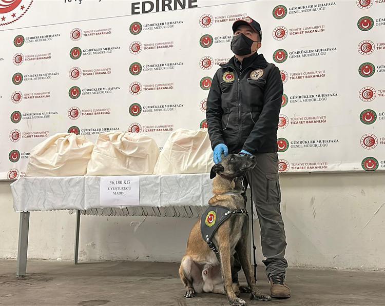 Edirne'den Bulgaristan'a açılan Kapıkule Sınır Kapısı'na, yurda giriş yapmak üzere gelen kamyonette, eğitimli köpek 'Alfa' ile yapılan aramada 36 kilo 180 gram kokain ele geçirildi.