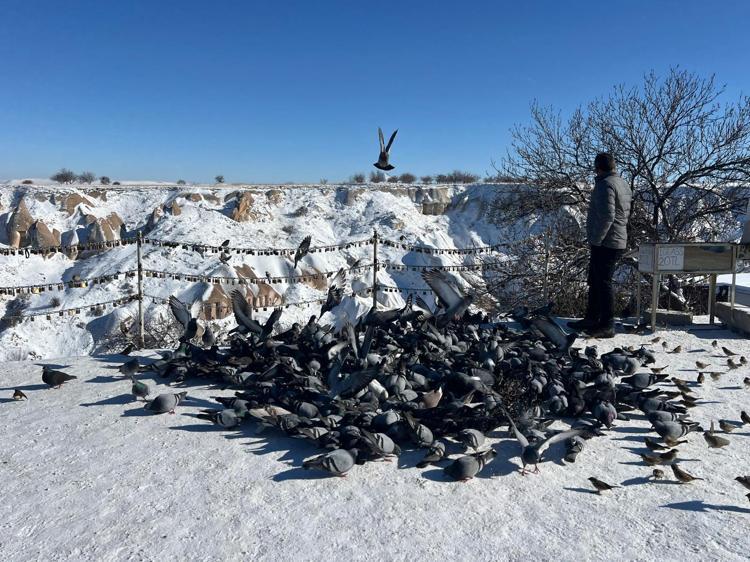 Peribacaları ile doğal kaya oluşumlarıyla yerli ve yabancı turistlerin ilgi odağı olan Kapadokya, yılbaşı gecesi yağan karın ardından beyaz örtüyle kaplandı. Kar yağışı ile bölgeye gelen turistler, Güvercinlik Vadisi’ndeki güvercinleri besledi. Bazı turistler ise kar altında kalan peribacaları manzarasında fotoğraf çekti.