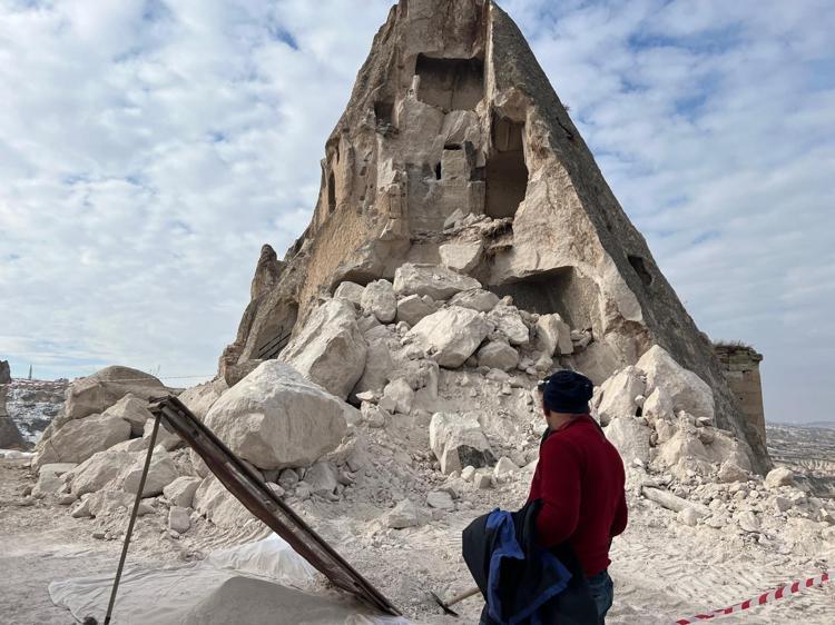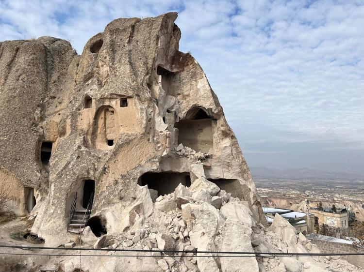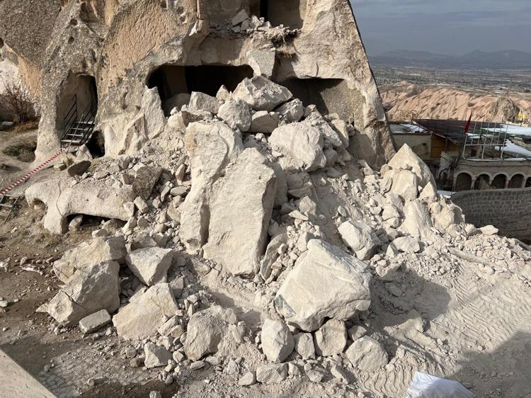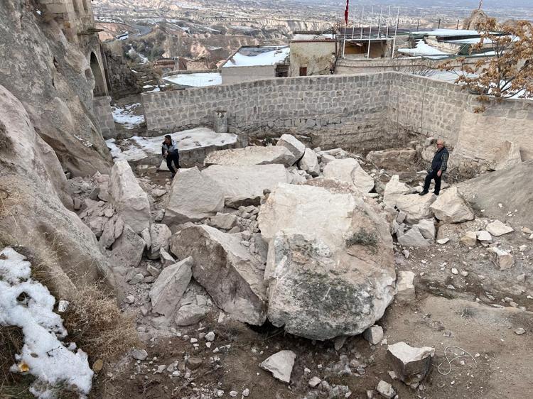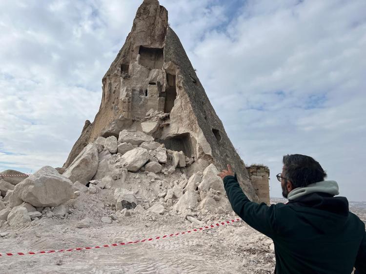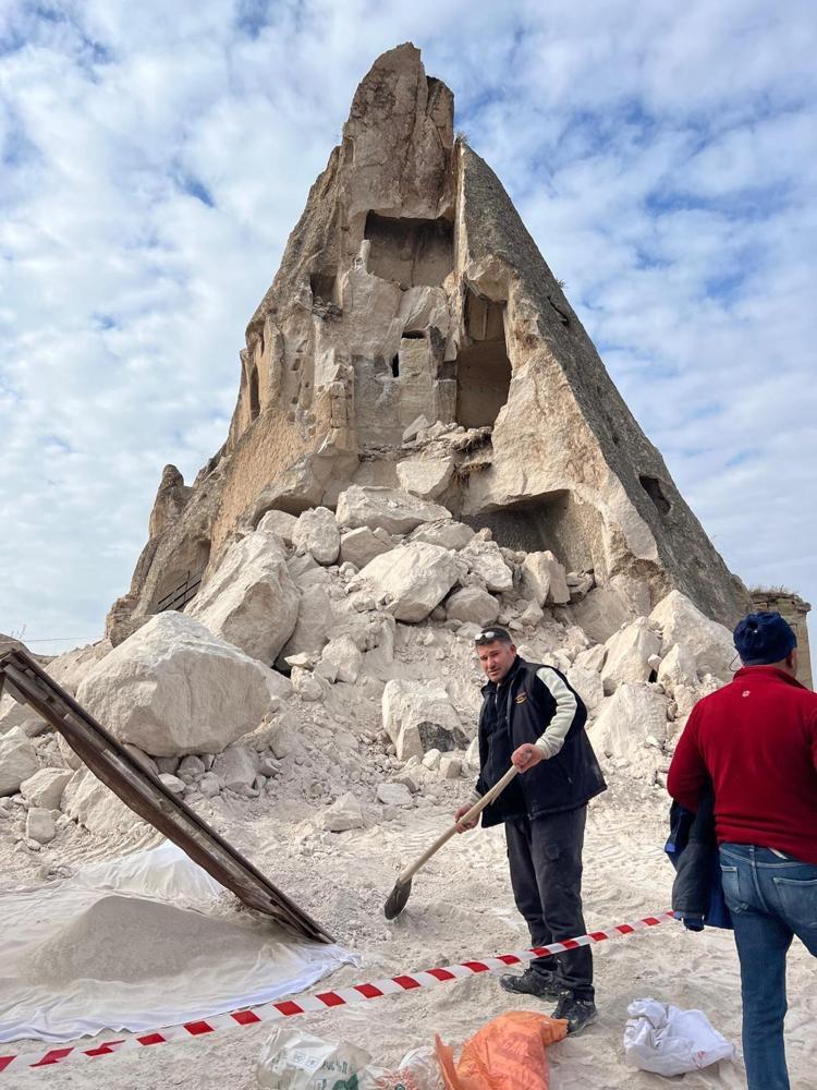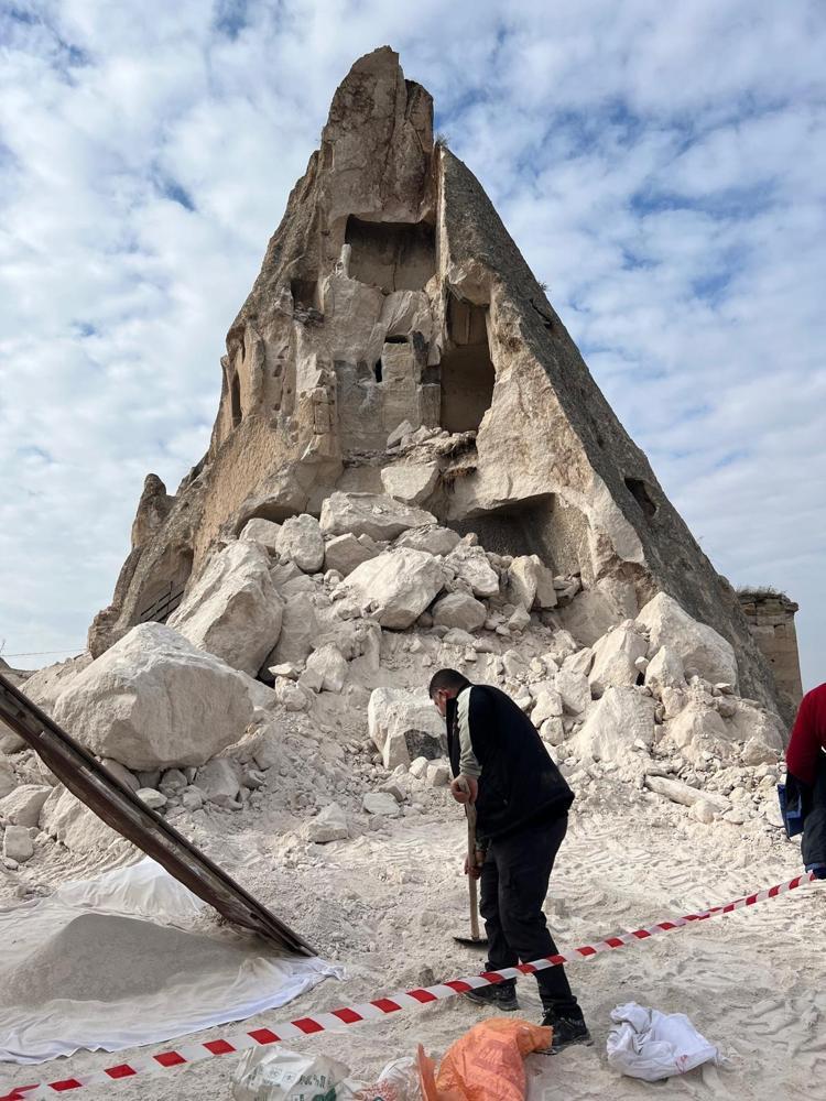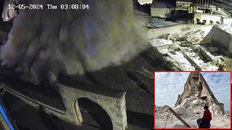 Peribacasından saçılan kaya parçaları çevreye dağıldı. Olay, güvenlik kamerasına yansıdı. Peribacasının bitişiğinde bulunan diğer peribacaları da yıkılma riskiyle karşı karşıya kaldı.