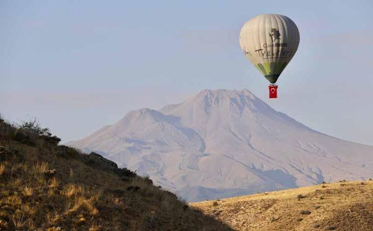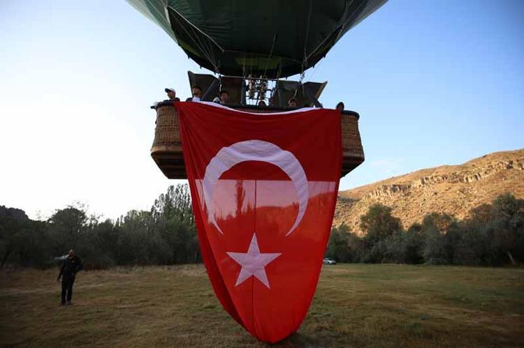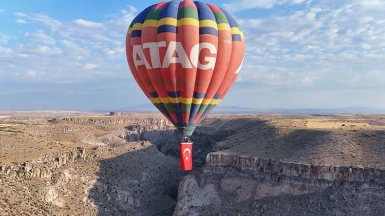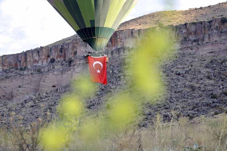 Kapadokya'nın incisi Ihlara Vadisi'nde sıcak hava balonlarından bazılarının sepetine 30 Ağustos Zafer Bayramı'nın 102'nci yıl dönümü nedeniyle Türk bayrakları asıldı.