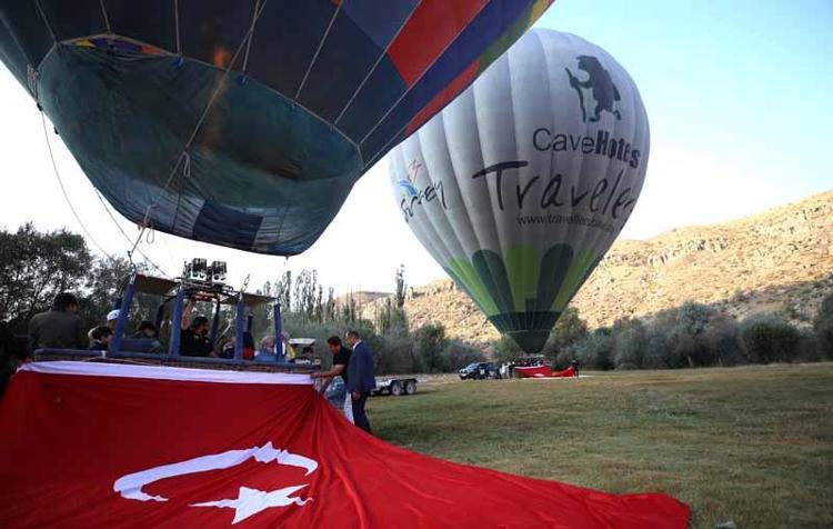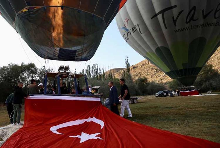 Türkiye'nin önemli turizm merkezlerinden Kapadokya'da Türk bayrakları ile donatılan sıcak hava balonları, 30 Ağustos Zafer Bayramı'na özel 'zafer uçuşu' ile havalandı.