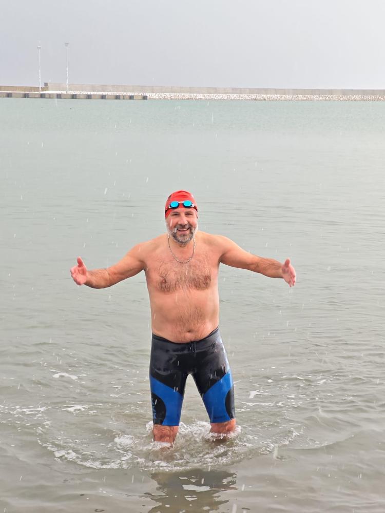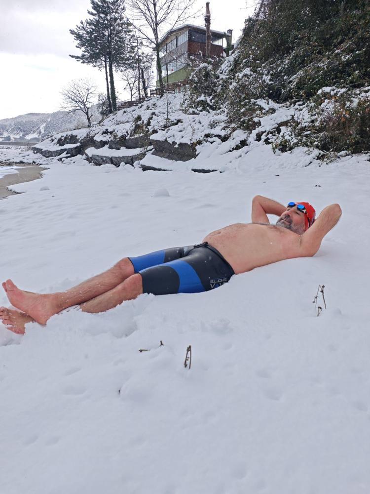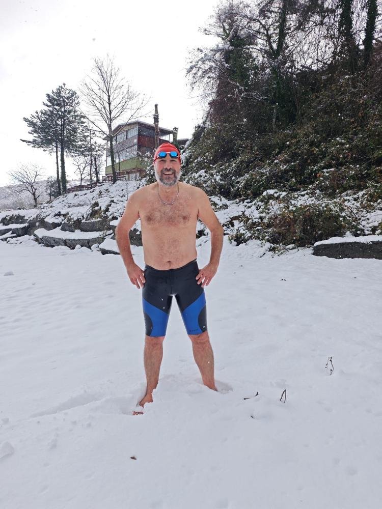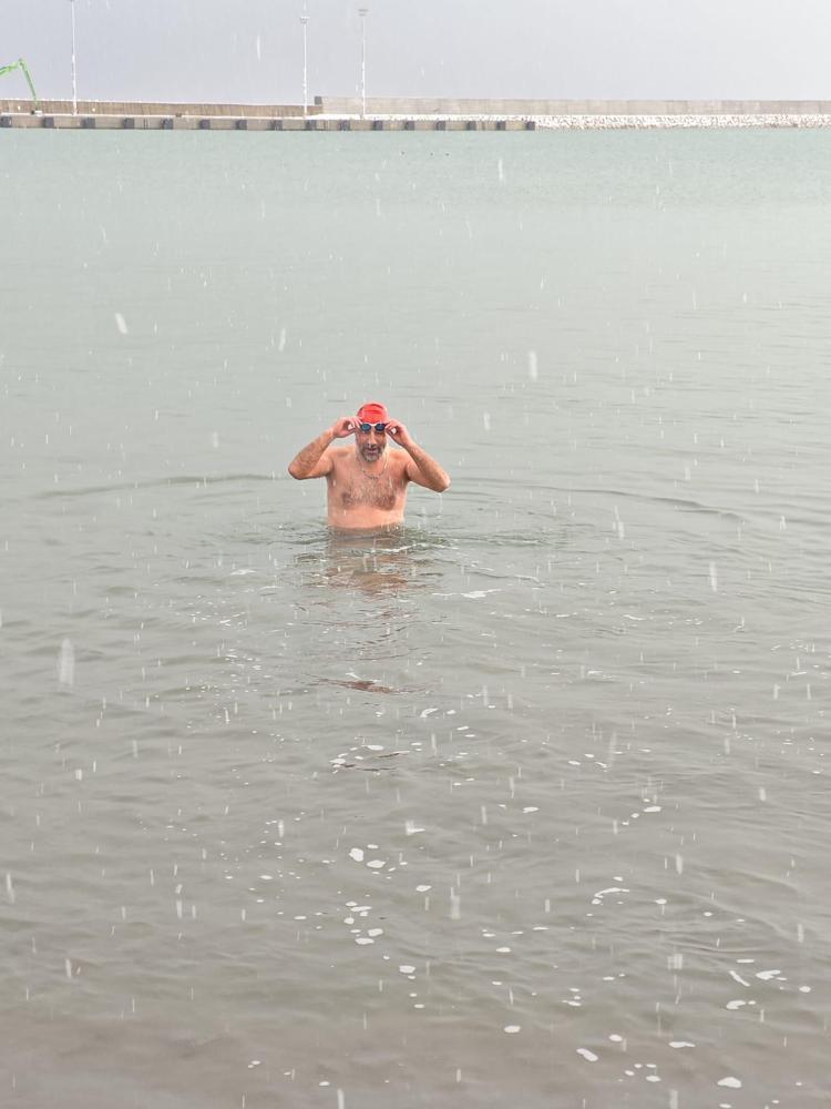 İnebolu'da yaşayan açık su master yüzücüsü Saim Gürel, hava sıcaklığının 4, deniz suyu sıcaklığının 9 derece ölçüldüğü ilçede kar yağarken denize girdi.