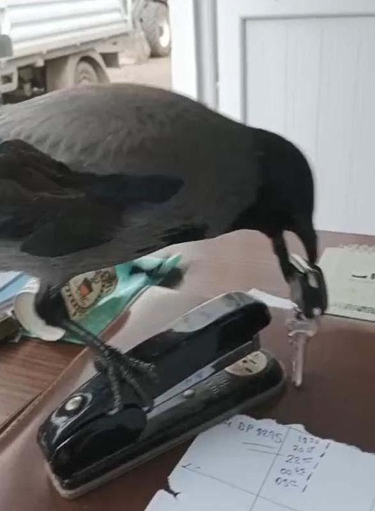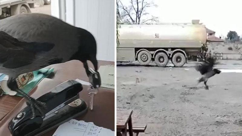 Zonguldak'ın Çaycuma ilçesinde Filyos Belediyesi Fen İşleri çalışanlarının 'Karabaş' ismini verdikleri karga, garaj amirinin odasına girerek masanın üstündeki garaj anahtarını aldı. Karganın gagasındaki anahtarla uçtuğu anlar cep telefonu kamerasıyla görüntülendi. Belediye çalışanı Osman Yılgın anahtarı bulduklarını, ‘Karabaş’ı severek beslediklerini söyledi.