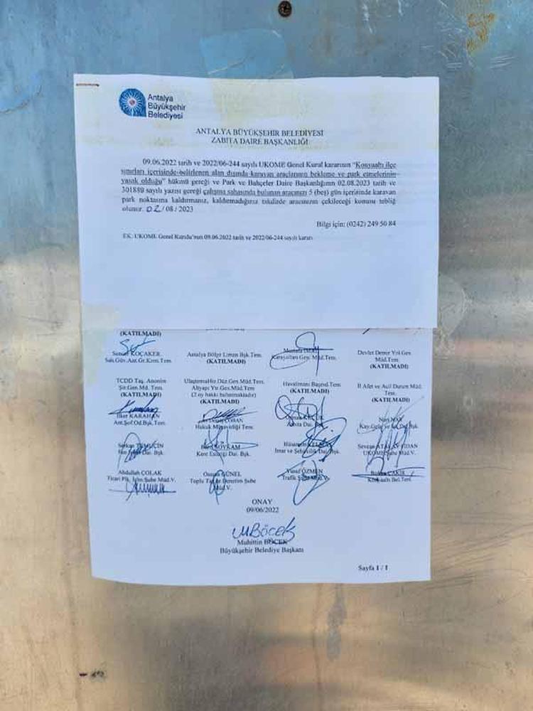 Karavanların camına bantla yapıştırılan tebligatta Ulaşım Planlama ve Raylı Sistem Dairesi Başkanlığı (UKOME) Genel Kurulu'nun kararı gerekçe gösterilerek karavanların kent içinde gelişigüzel park ve bekleme yapmasının yasak olduğu bildirildi. Karavan sahiplerine 5 gün süre verildiğinin belirtildiği tebligatta, “Kaldırmadığınız takdirde aracınızın çekileceği tarafınıza tebliğ olunur" ifadeleri yer aldı.