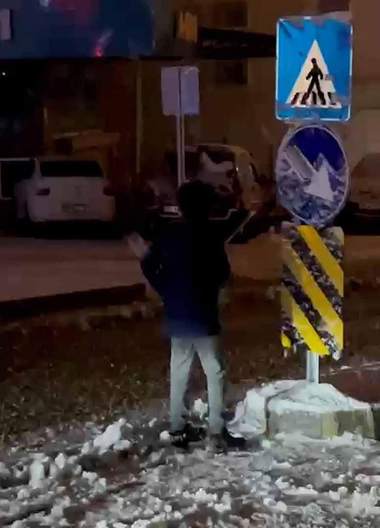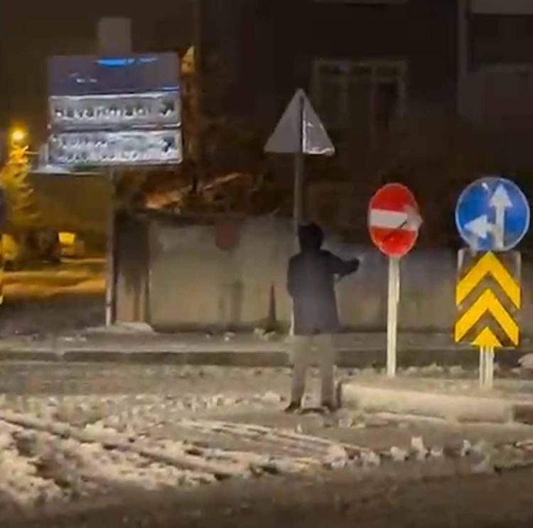 Karla kaplanan trafik levhalarını temizleyen 12 yaşındaki Kadir Emin, takdir topladı
