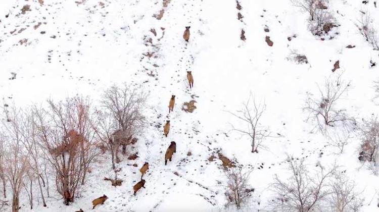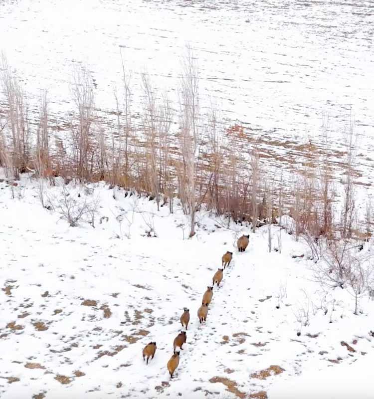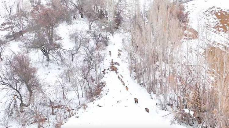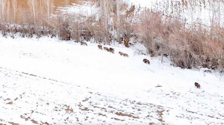 Bölgede doğa çekimleri yapan Fatih Civan ve Emre Ekinci'nin dron kamerasına takılan 11 yaban domuzu, karla kaplı arazide bir süre ilerleyip, daha sonra gözden kayboldu.